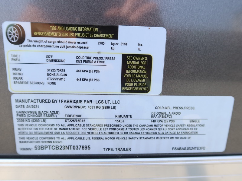T/A, 24' X 8'6", 9,990 LB GVWR, ENCLOSED TRAILER, SPRING SUSPENSION, SIDE DOOR, REAR RAMP DOOR, ELECT BRAKE, ST225/75R15