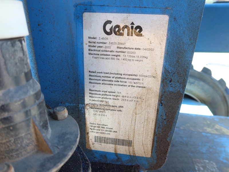 4X4 ARTICULATED BOOM LIFT, 51'6" WORKING HEIGHT, 24'8" HORIZONTAL REACH, 500LB PLATFORM CAPACITY, 110V RECEPTICAL AT PLATFORM, 4 CYL GAS/LPG