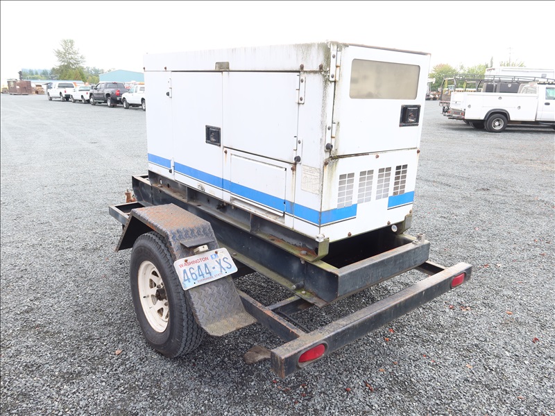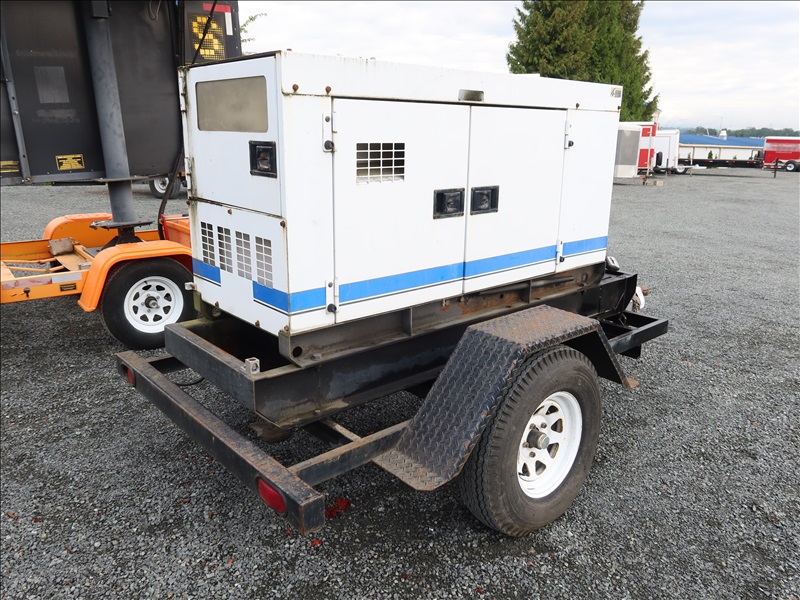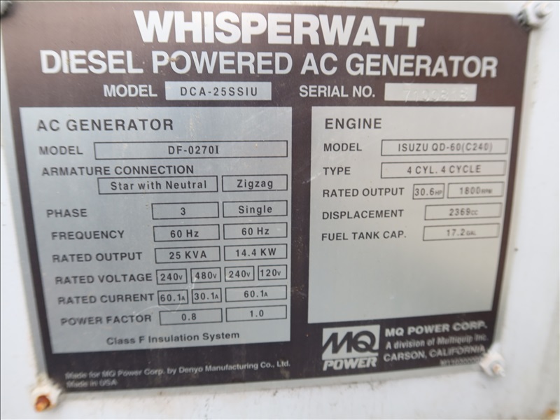 S/A, WHISPERWATT DCA-25SSIU 25 KVA TRAILER MOUNTED GENERATOR, ISUZU 4 CYL DIESEL ENGINE, 120/240/480V, SINGLE OR 3 PHASE, ELECT BRAKES, 7.00-15 (IGNITION BROKEN, STARTS, NO KEY)