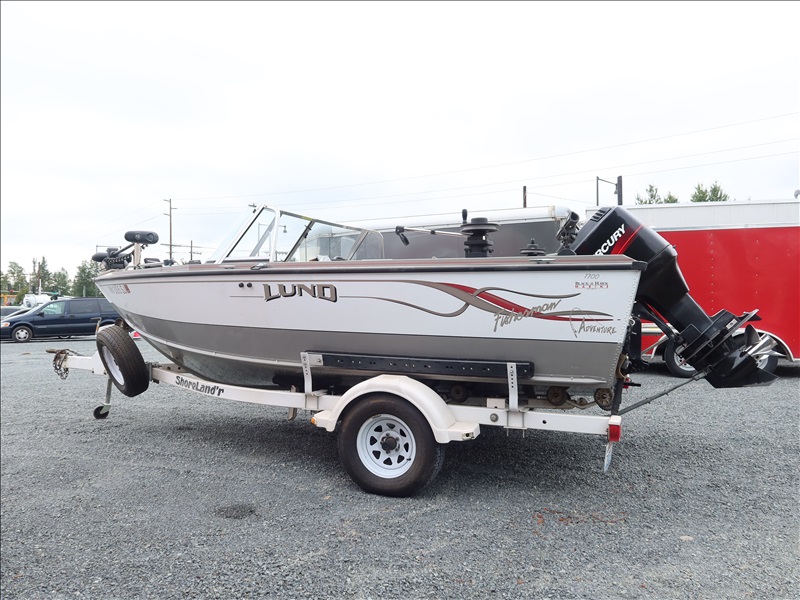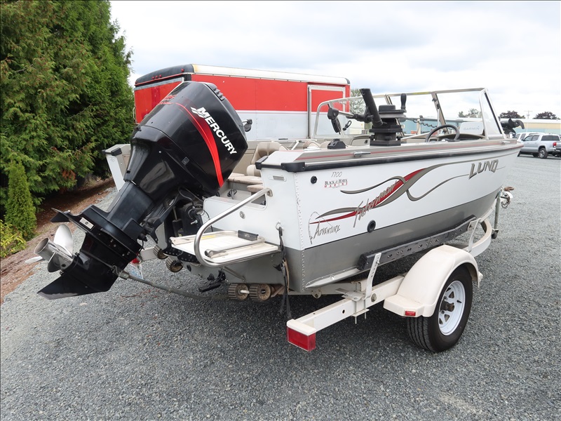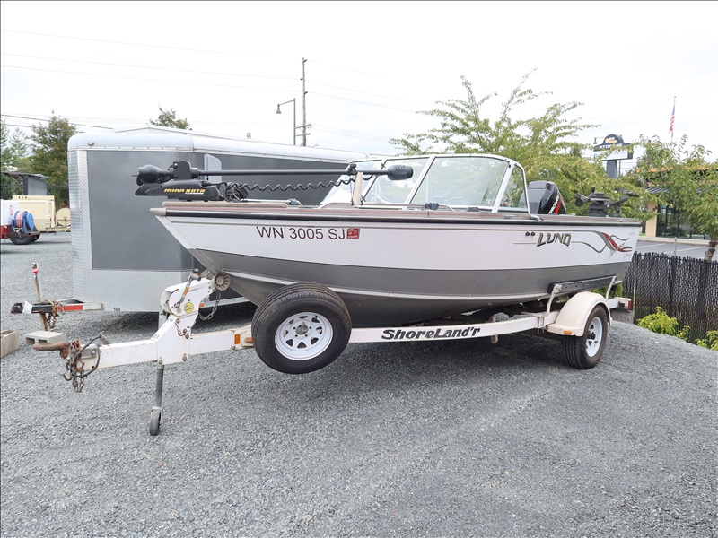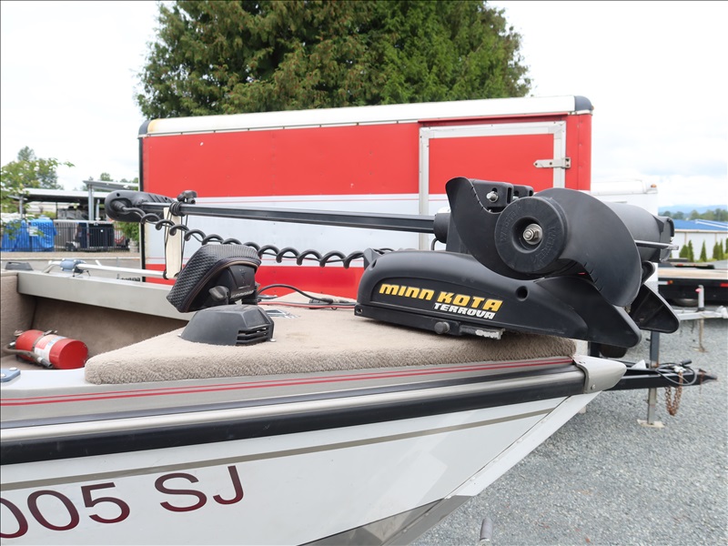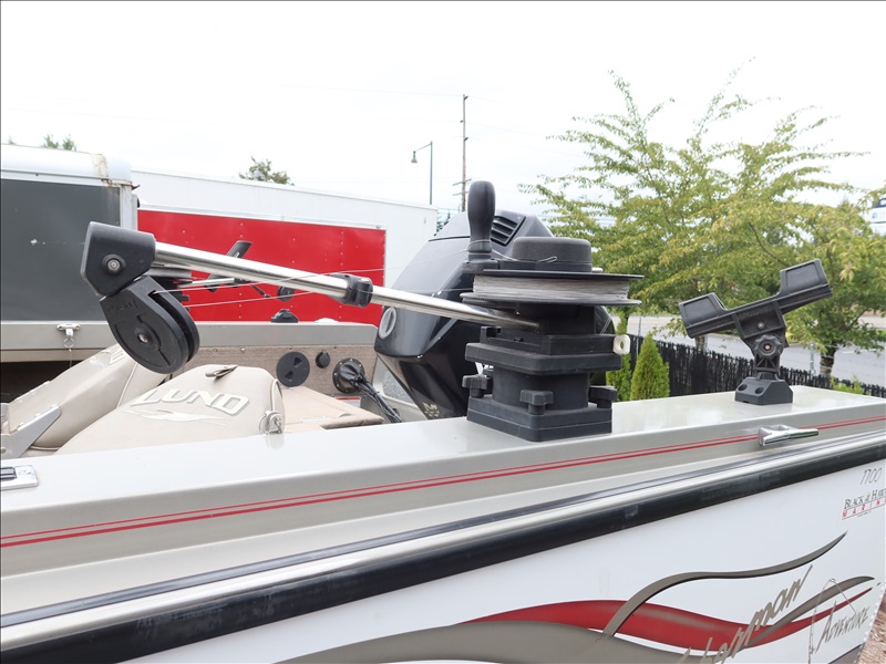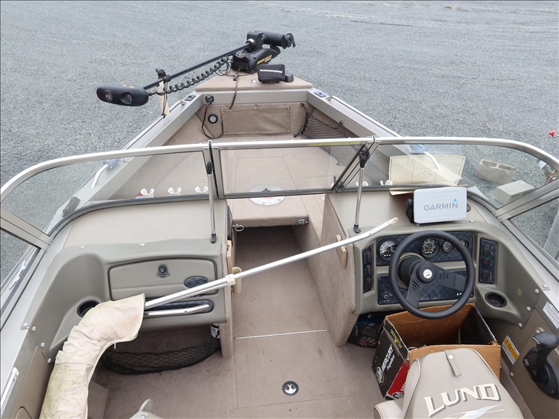 17' OPEN BOW ALUMINUM BOAT W/BIMINI TOP, MERCURY 125 ENGINE, MINN KOTA TERROVA 80 BOW MOUNTED TROLLING MOTOR W/REMOTE, GARMIN ECHOMAP UHD74CV CHART PLOTTER, HUMMINGBIRD HELIX 5 SONAR FISH FINDER, SCOTTY MANUAL DOWN RIGGERS W/2002 MIDWEST 2X4W23SW SHORELAN