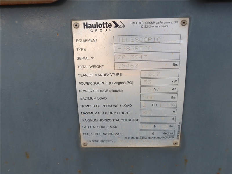 4WD TELESCOPIC BOOM LIFT, 85' PLATFORM HEIGHT, 78' HORIZONTAL REACH, 500 LB CAPACITY, 110V RECEPTICAL AT PLATFORM, KUBOTA V2607-T, SOLID AIR 1025X365