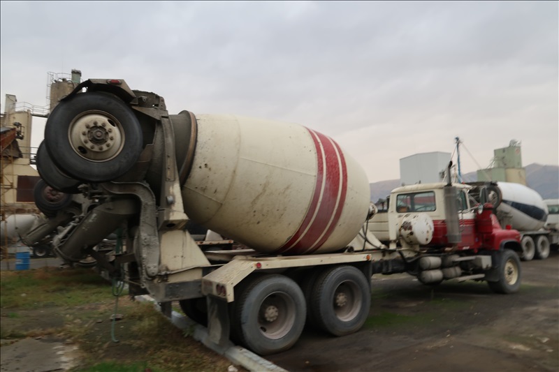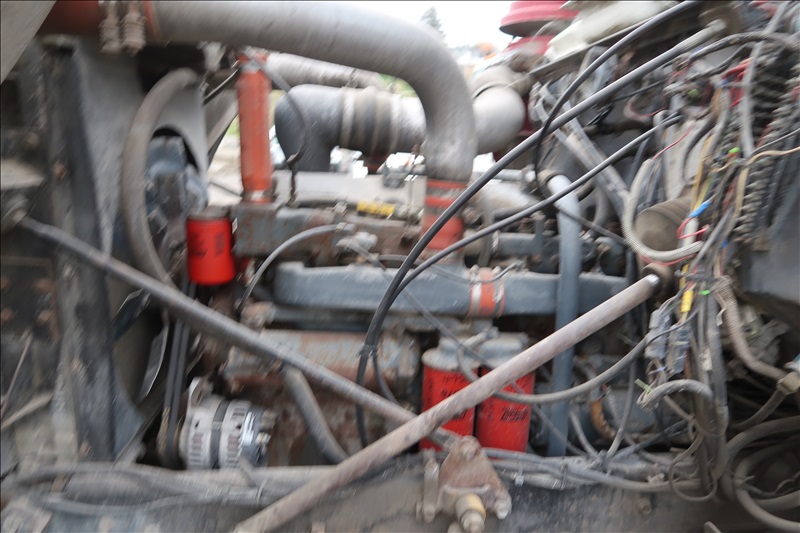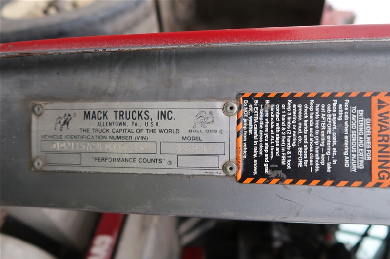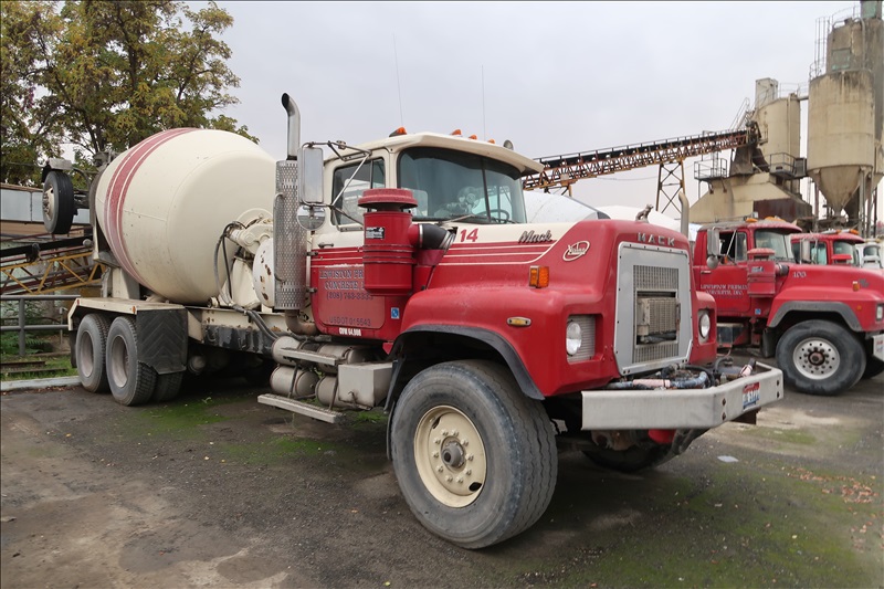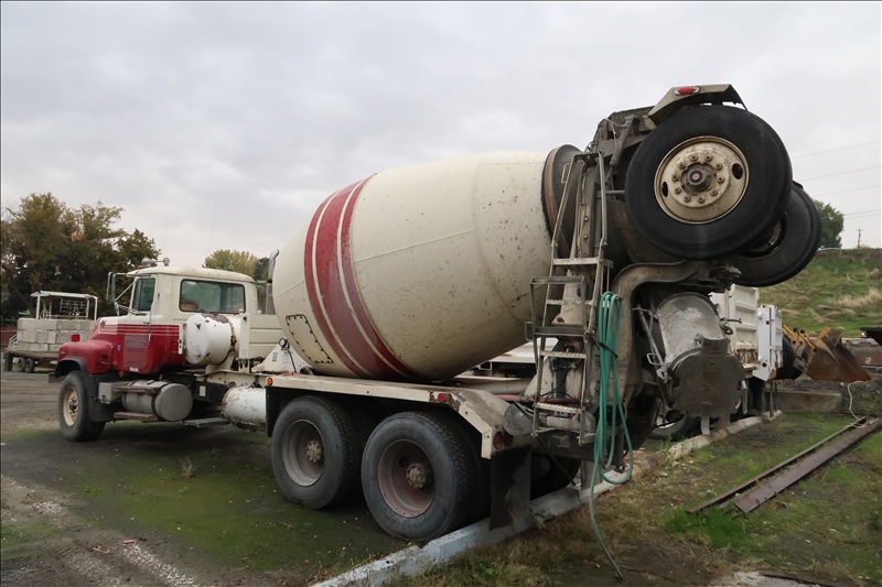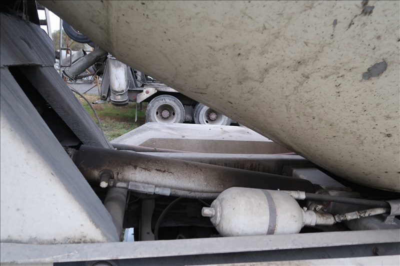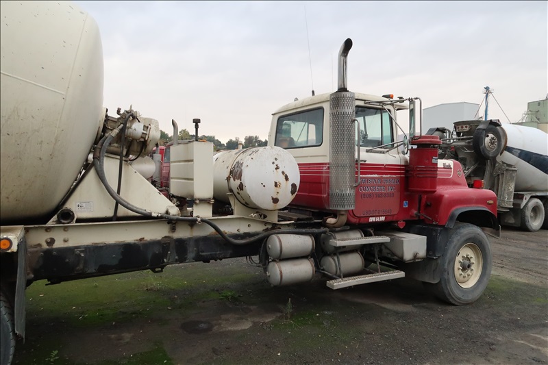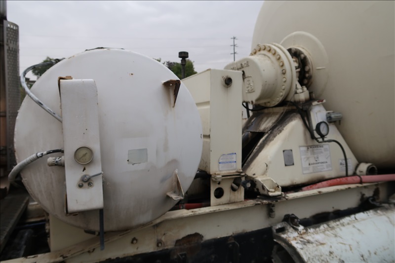 TRI-AXLE MIXER TRUCK, 6-CYL DIESEL, 13-SPD, CHALLENGE HYDRAULIC MIXER, 34,000 REARS, 17,000 FRONT, BEAM SUSPENSION, STRONG ARM SINGLE AXLE BOOSTER, WATER SYSTEM (UNIT #91)