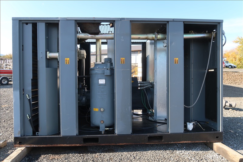 ROTARY SCREW AIR COMPRESSOR, VARIABLE SPEED DRIVE W/SIEMENS 392 HP/1,775 RPM MOTOR (REBUILT IN 2020), BUILT IN COMPRESSED AIR REFRIGERANT DRYER, AIR COOLED (MISSING SOME SIDE PANELS)(LOCATED IN GRANGEVILLE, ID)