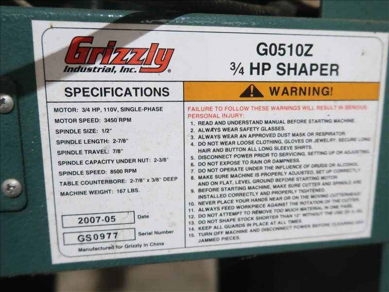 3/4 HP SHAPER MOUNTED ON STAND, 3/4" SPINDLE, 3,450 RPM, 110V