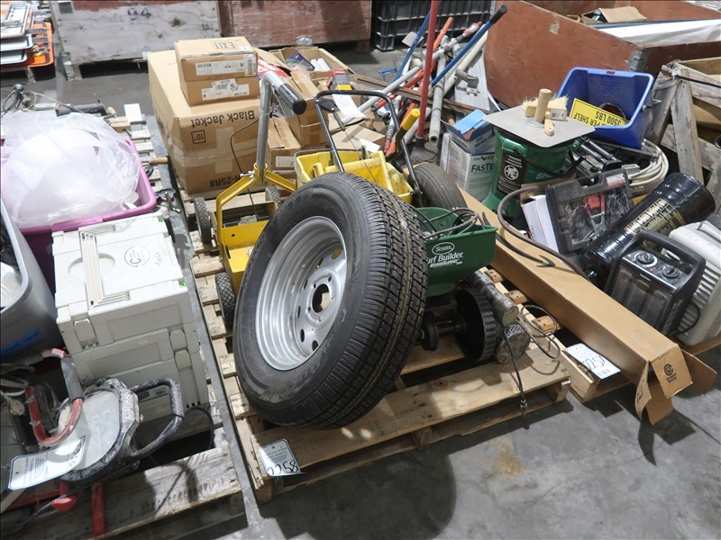 LOT, (1) RUSTOLEUM STRIPING MACHINE, (1) SCOTTS TURF BUILDER MINI WALK-BEHIND BROADCAST SPREADER, (1) MARATHON 4.80/400-8 WHEELBARROW TIRE & (1) CASTLE ROCK ST ST205/75R15 MOUNTED TIRE ON THIS PALLET
