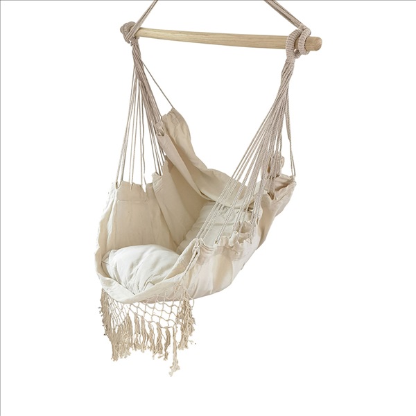 (700)Hanging Rope Swing Hammock Chair with Side Pocket and Wooden Spreader Bar - Ivory