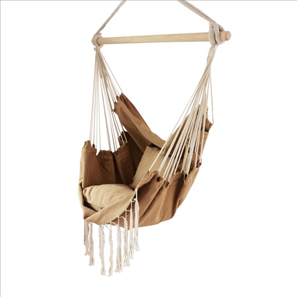 (600)Hanging Rope Swing Hammock Chair with Side Pocket and Wooden Spreader Bar -Khaki Color