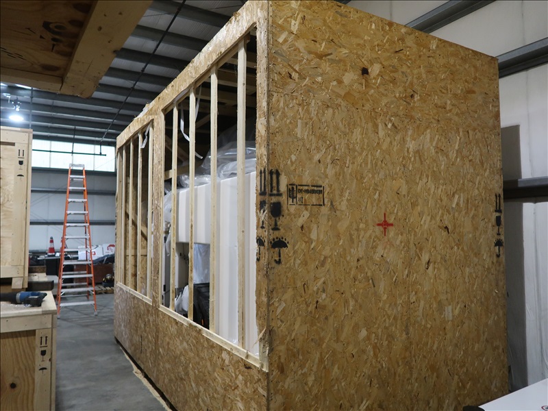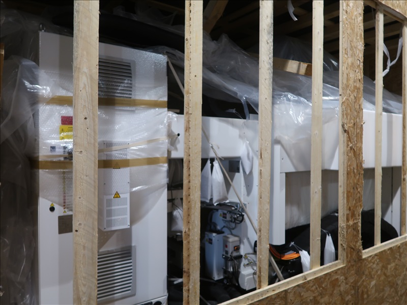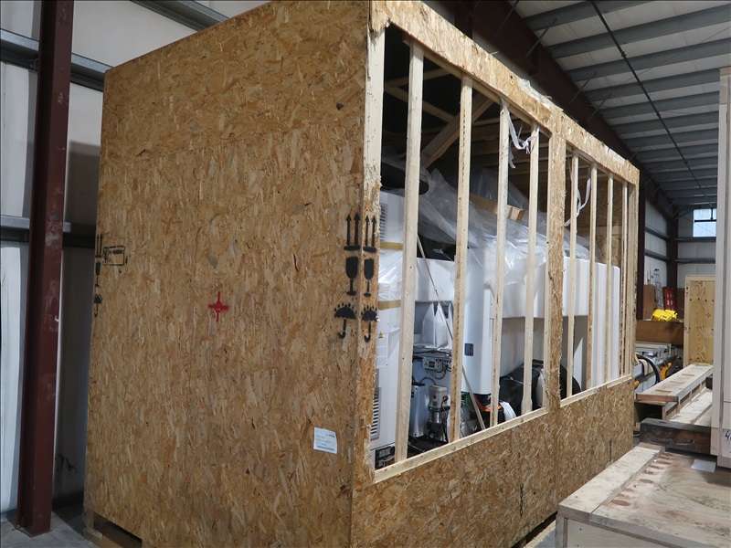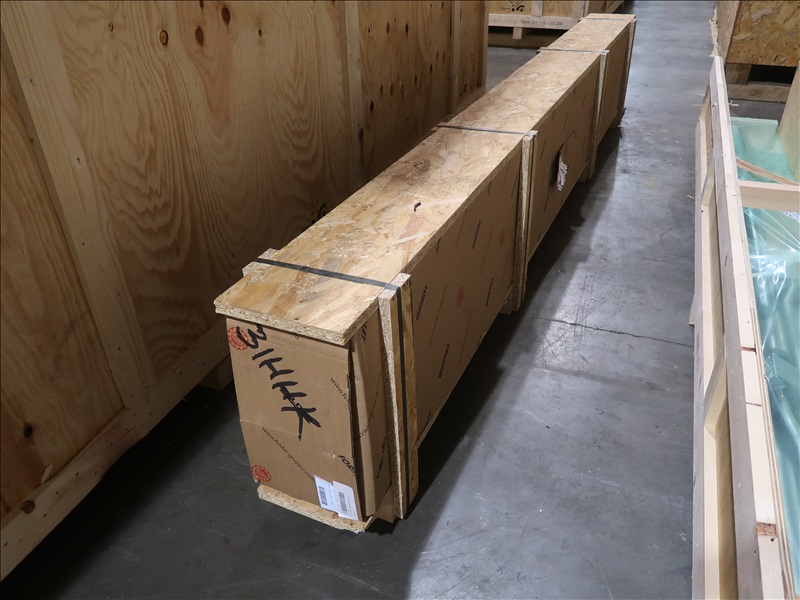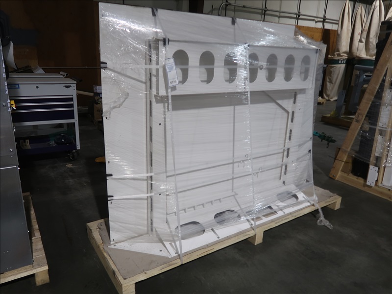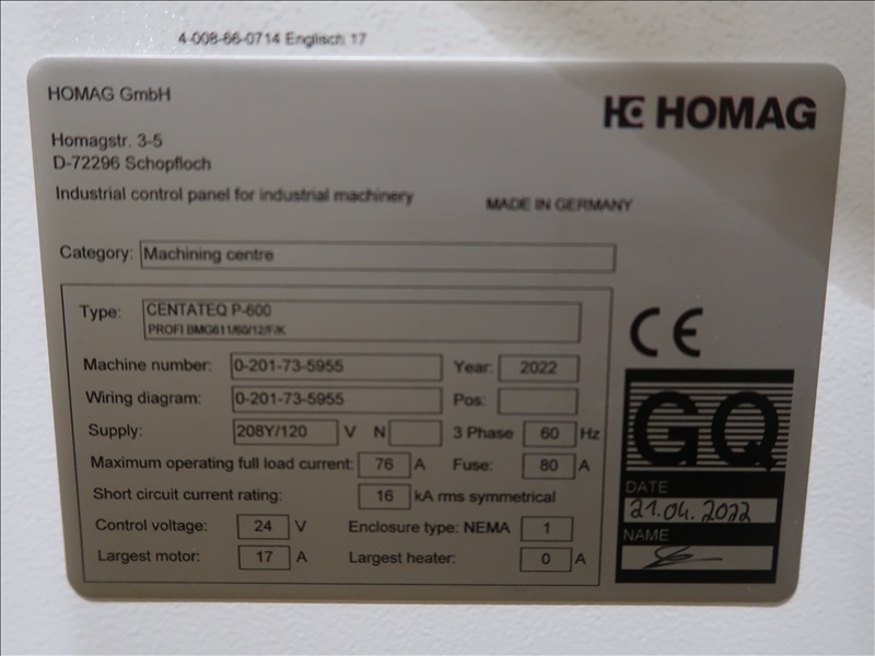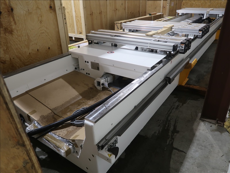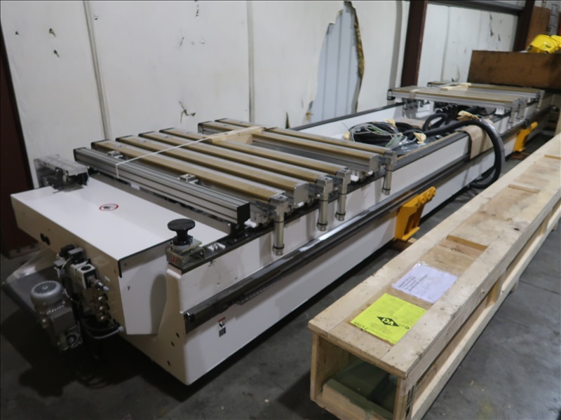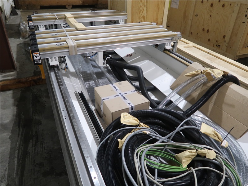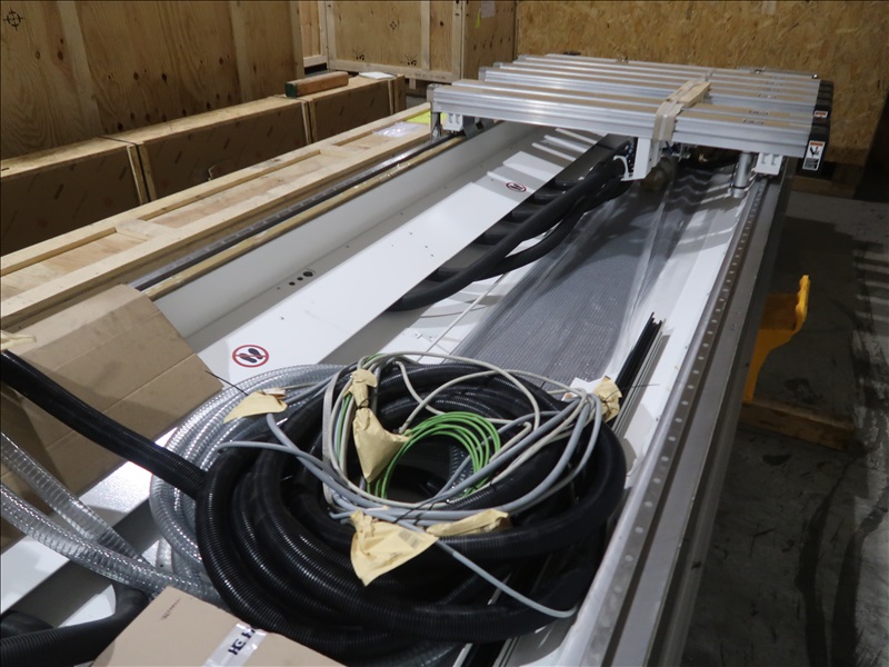 CNC MACHINING CENTER, 27' CLAMPING TABLE, HIGH Z-AXIS, 5-AXIS HEAD, (4)BORING/TRIMMING SPINDLES, MOVING GANTRY W/BILATERAL DRIVE, CENTRAL SWITCH CABINET W/MULTI TOUCH DISPLAY, CHIP CONVEYOR BELT (SET UP FOR EXTERNAL SUCTION DEVICE), SPINDLE COOLER, FENCED ENCLOSUER FOR CNC & TABLE, 208/120V, 60HZ, 3-PHASE, S/N: 0-201-73-5955