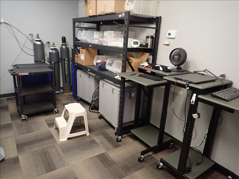 SHELF UNIT, (2) CARTS, (2) WORKSTATIONS & MISC. SUPPLIES