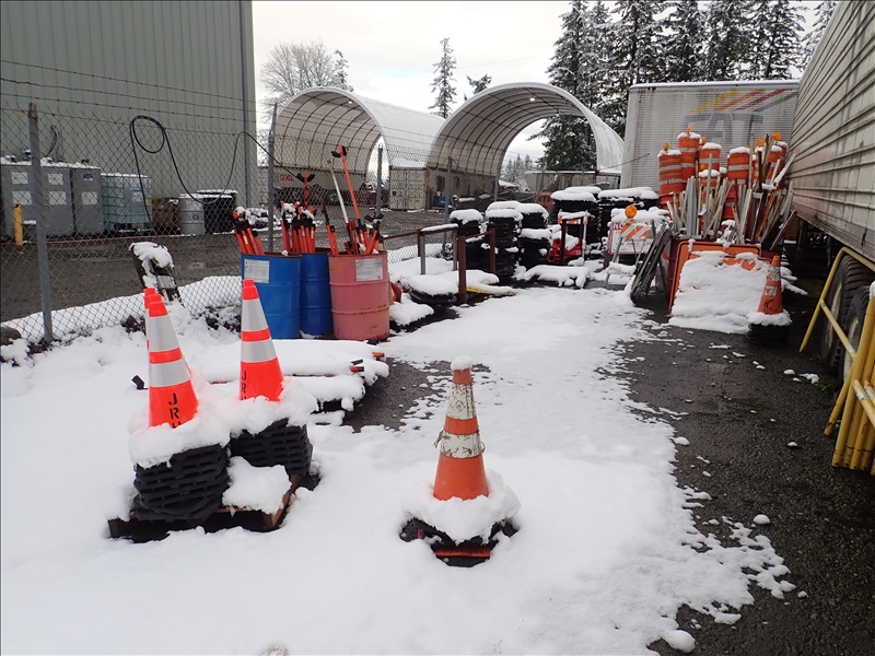 GROUP OF TRAFFIC CONES, BARRELS, SIGNS, BARRICADES, STANDS & BASES