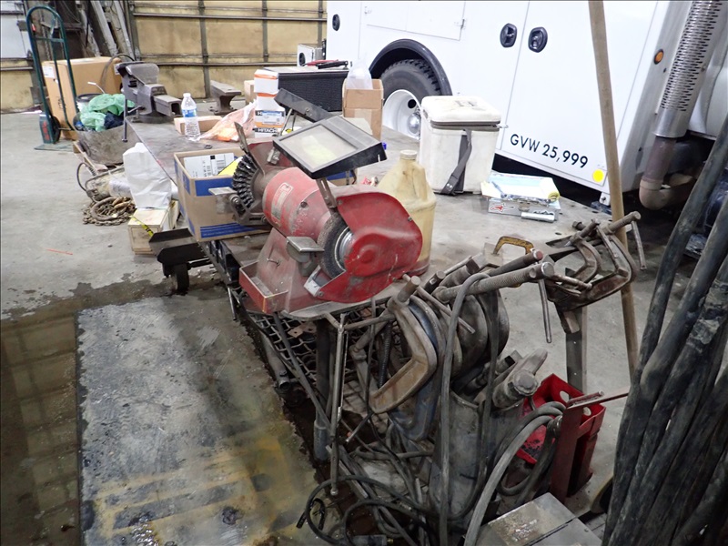 STEEL TABLE, VISE, BENCH GRINDER, CLAMPS, ANVIL