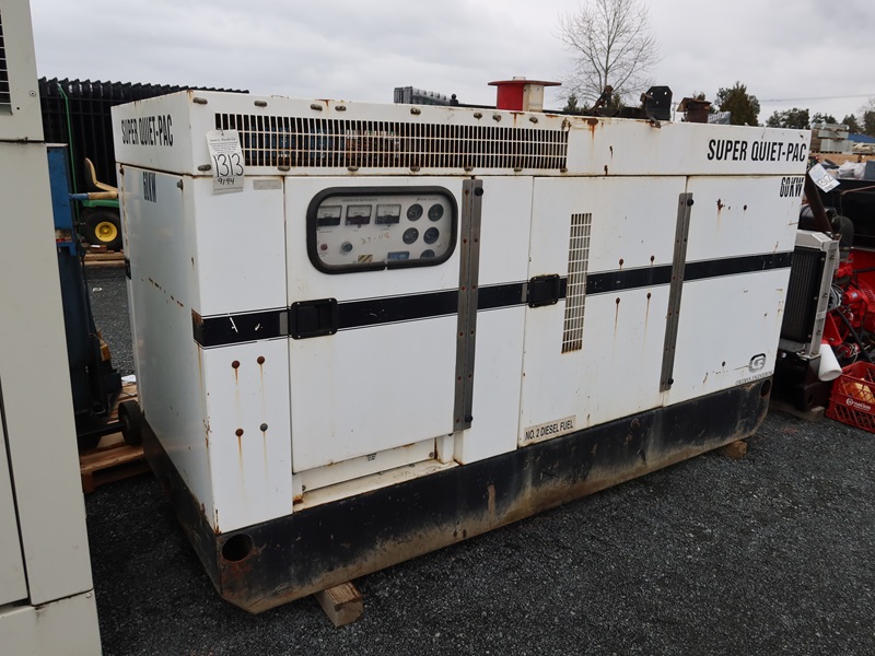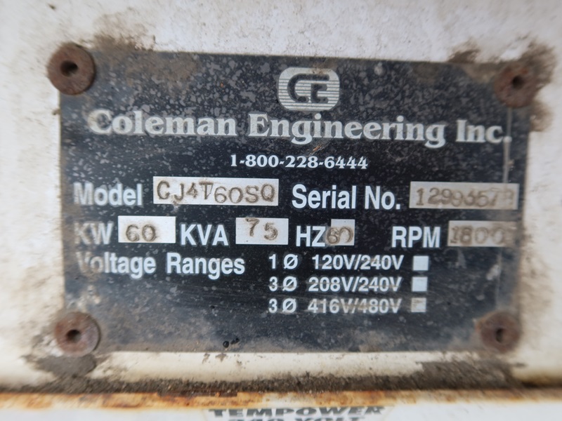60 KW SKID MOUNTED GENERATOR W/JOHN DEERE 4045TF150C 4.5 LITER DIESEL ENGINE, 120/240-480V, SINGLE PHASE/3 PHASE, HOUR METER READS: 10,684
