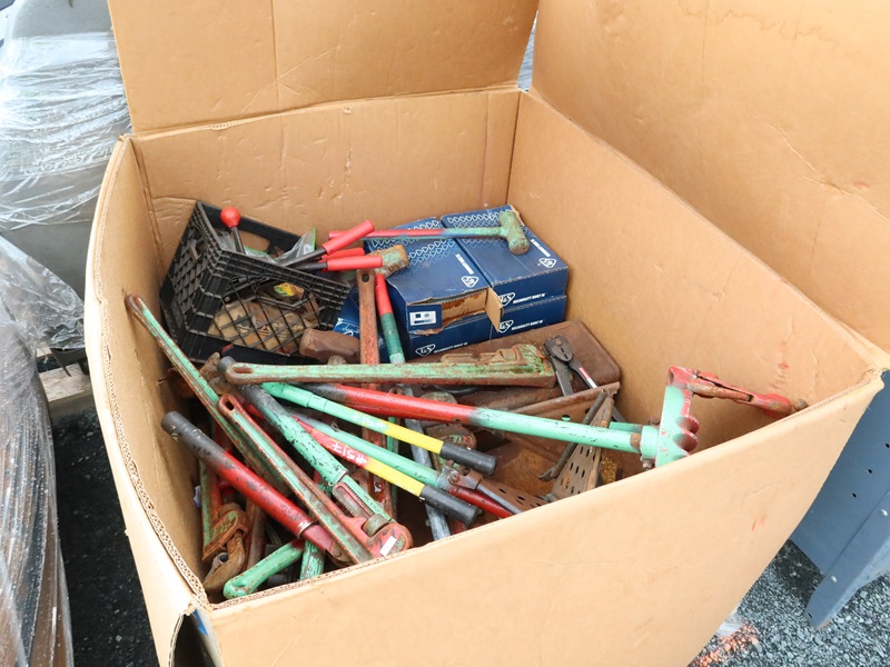 LOT, ASSORTED PIPE WRENCHES, CONTRACTORS TOOLS & SUPPLIES IN THIS BIN (MUST TAKE BIN)
