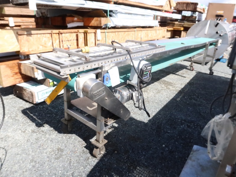 APPROX 14'9" STAINLESS STEEL CONVEYOR W/15-3/4"W RUBBER CONVEYOR BELT & ELECTRIC MOTOR, 380/460V, 3 PHASE