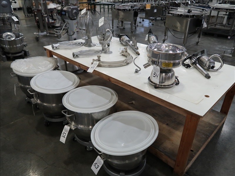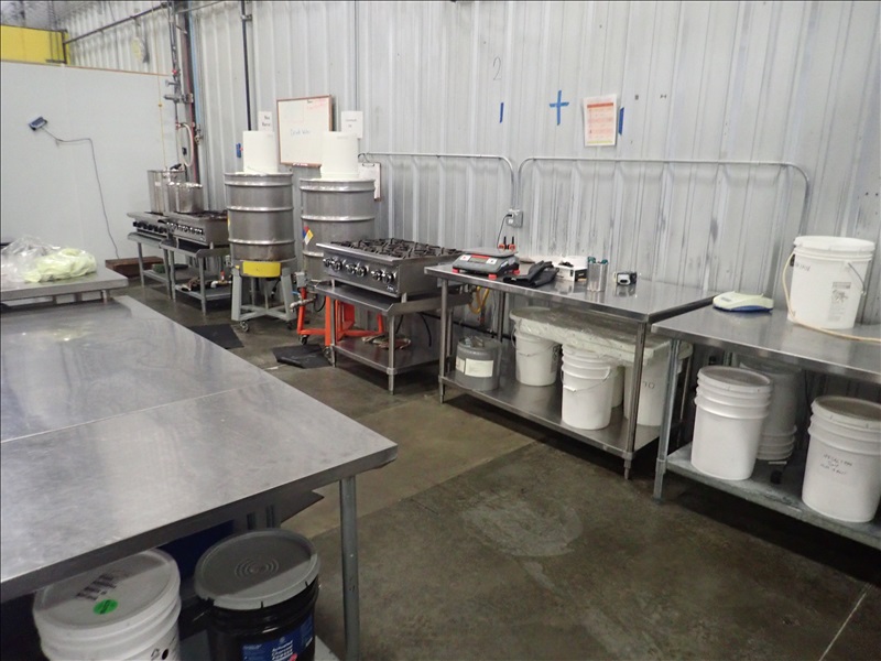 KITCHEN AREA TO INCLUDE: S/S SINKS, (4) 6-BURNER GAS RANGES, S/S TABLES, SCALES, FANS, POTS, KETTLES, DRY GOODS BINS, FANS, S/S DRUMS, STANDS & MISC.