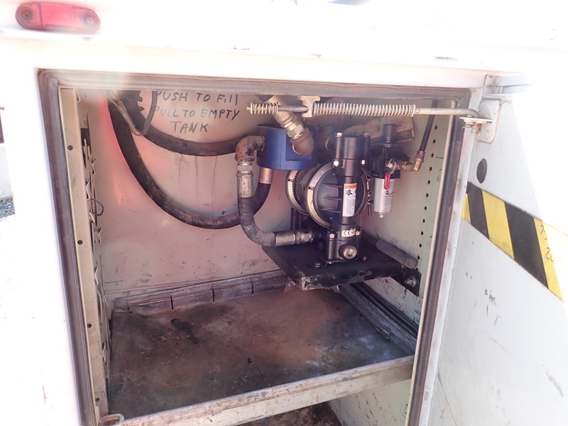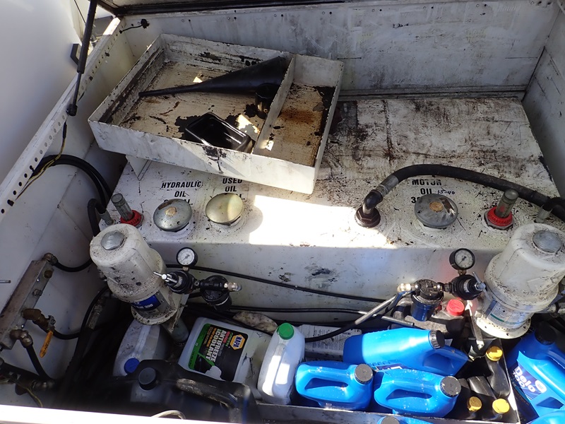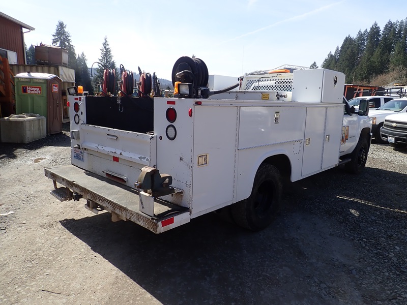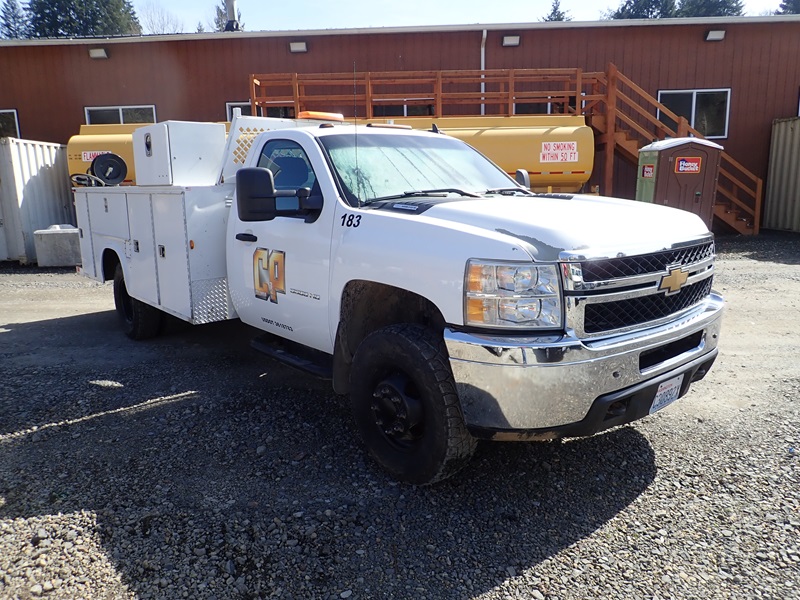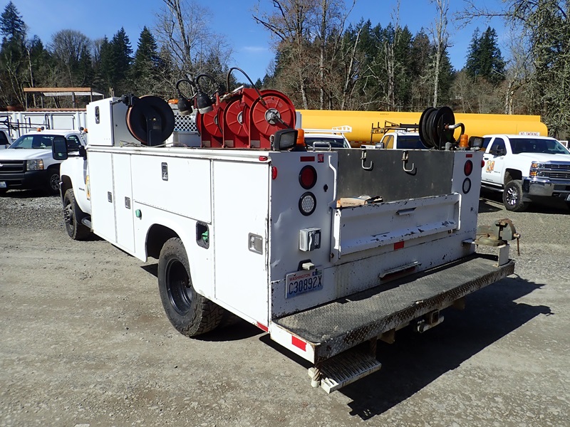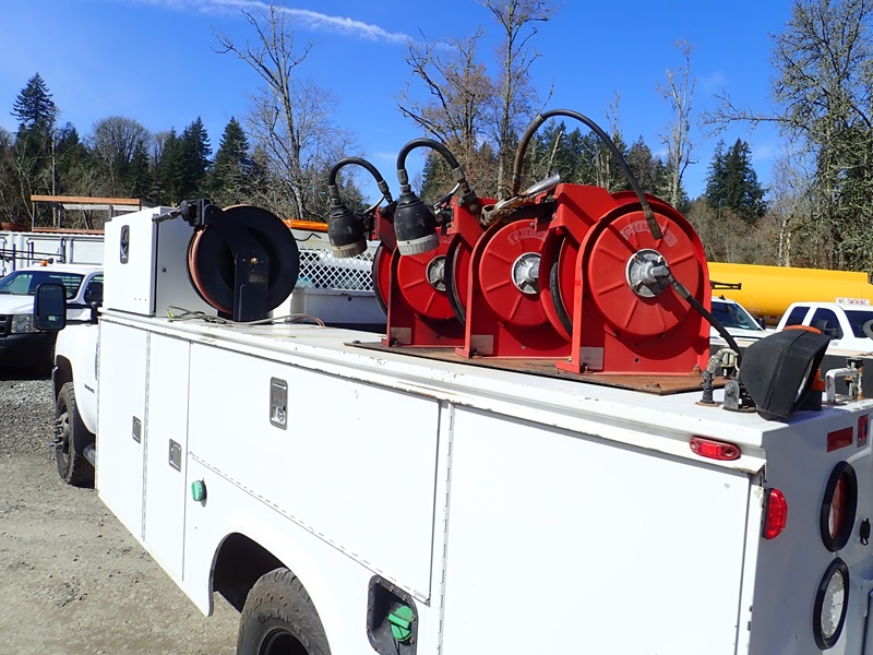 4X4 SERVICE BODY TRUCK, DURAMX, AUTO, 11' BODY, PRODUCT TANKS, REELS