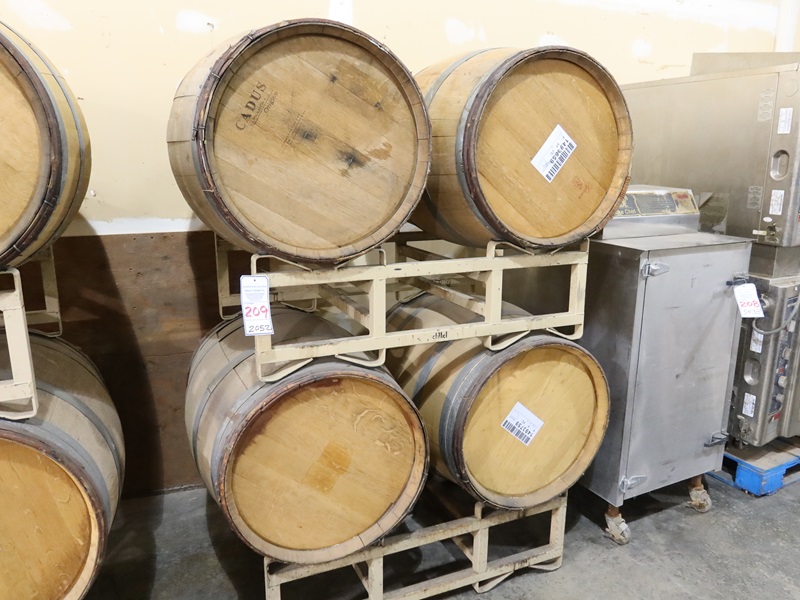 LOT, (4) DECORATIVE OAK BARRELS W/(2) BARREL STANDS (BARRELS NEED REPAIR)
