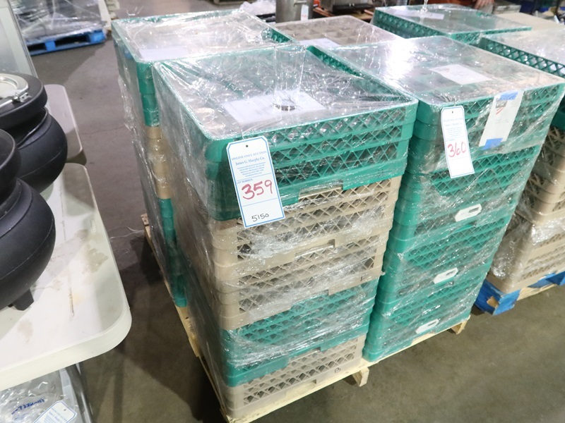 LOT, ASSORTED GLASSWARE IN THESE (5) GLASS RACKS