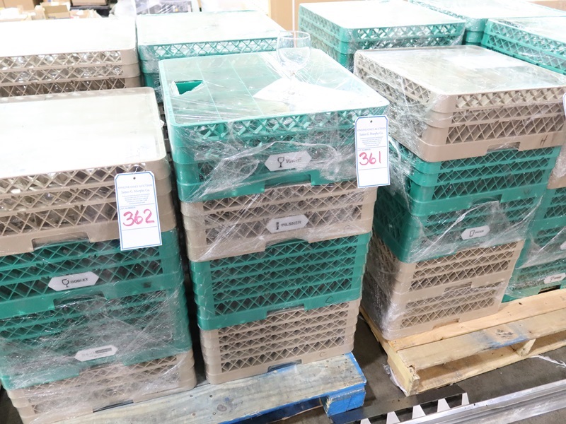 LOT, ASSORTED GLASSWARE IN THESE (4) GLASS RACKS