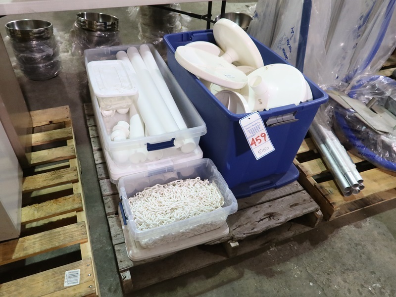 LOT, ASSORTED PLASTIC CROWD CONTROL STANCHIONS W/CHAIN ON THIS PALLET
