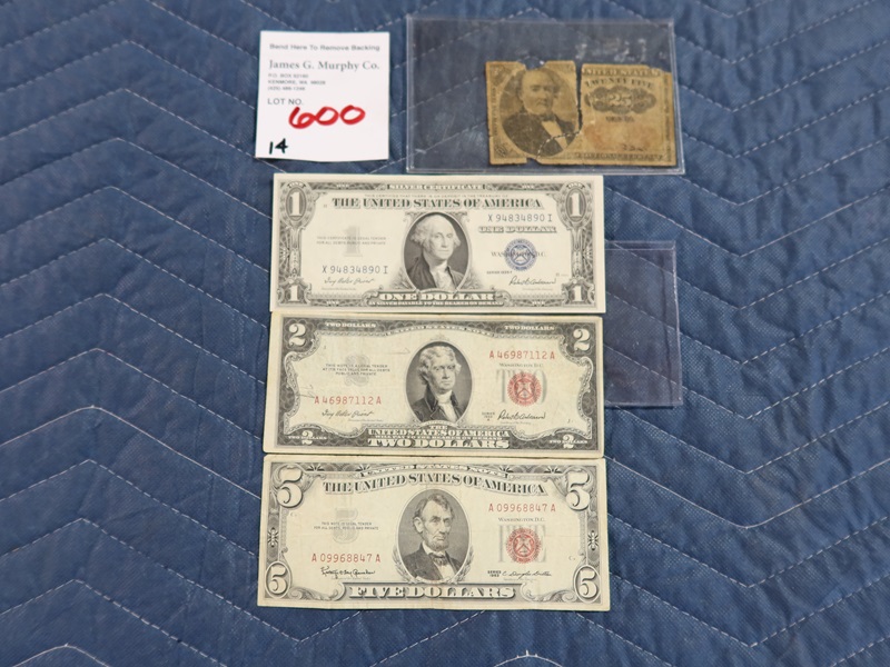 LOT, ASSORTED US CURRENCY, (1) 1963 $5, (1) 1953A RED SEAL BILLS, (1) 1935F $1 SILVER CERTIFICATE & (1) .25 CENT FRACTIONAL CURRENCY (DAMAGED)