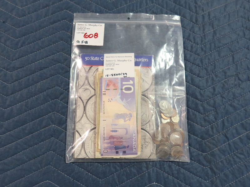 LOT, (51) STATRE QUARTERS 7 ASSORTED FOREIGN COINS & CURRENCY
