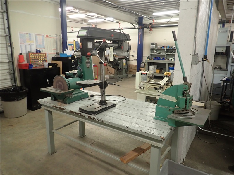 BENCHES WITH BELT/DISC SANDER, DRILL PRESS, CORNER NOTCHER, JET BD-920N MINI LATHE & MISC.