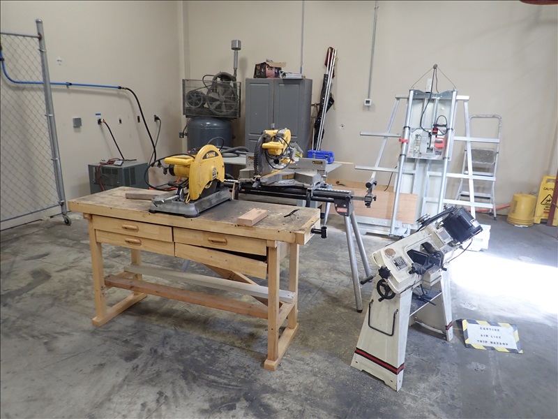 AIR COMPRESSOR, PANEL SAW, MITER SAW, HORIZONTAL BANDSAW, BENCH, CABINET & MISC.