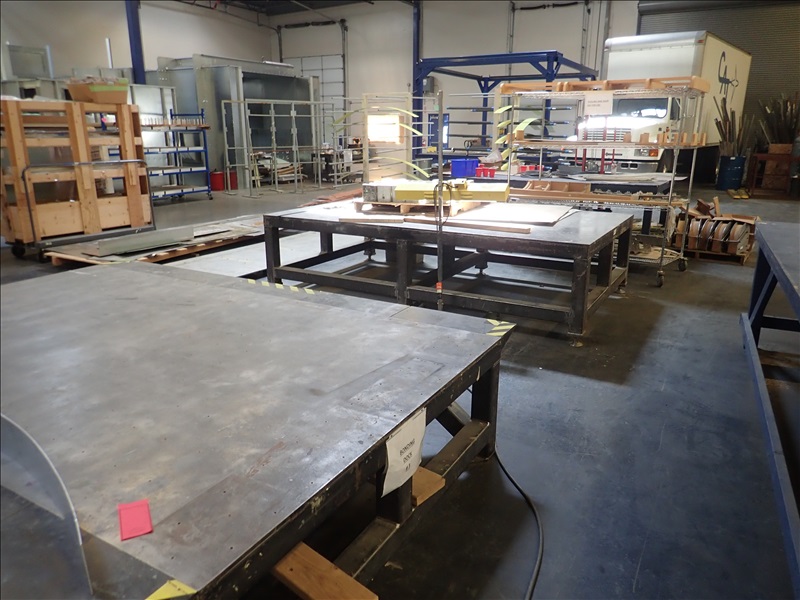 RACKS, (2) STEEL LAYOUT TABLES, BENCHES, WIRE RACKS, CARTS & MISC.