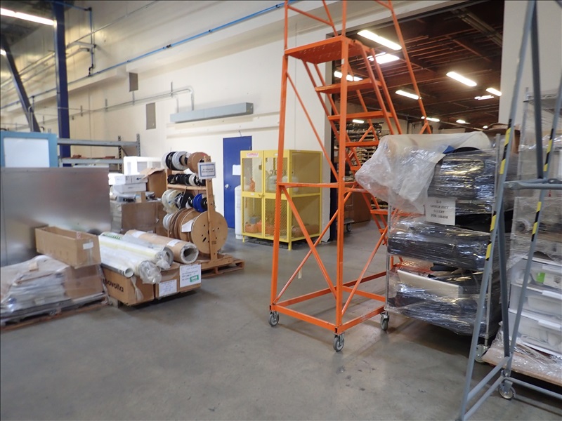 BOTTLE CAGE, WAREHOUSE LADDERS, WIRE RACKS, SHELVING, MATERIAL RACKS & MISC.