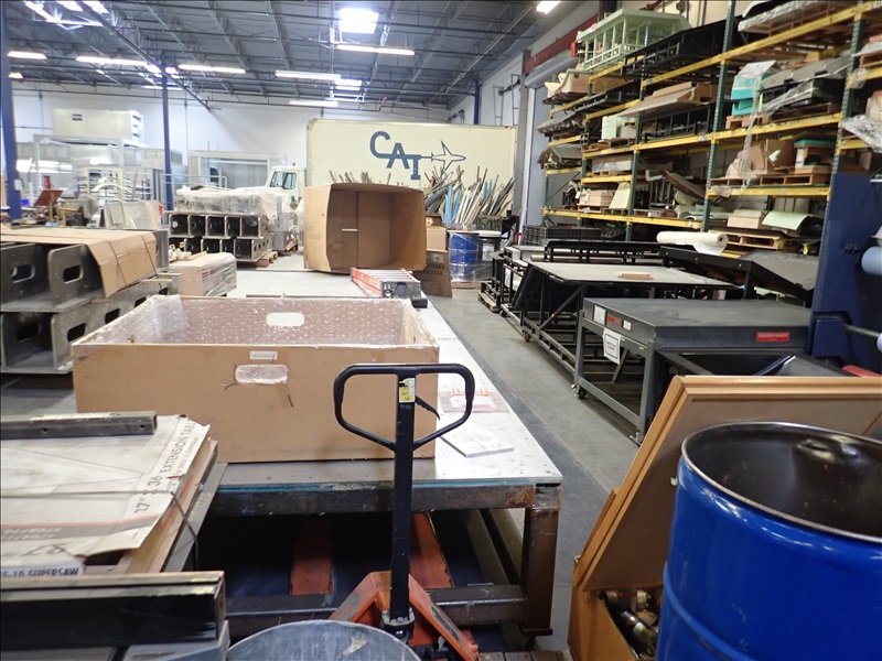 PALLET RACKING, (2) LAYOUT TABLES, GRANITE SURFACE BLOCK, DUST COLLECTOR, BINS, STANDS, TABLE SAW, RACKS & MISC.