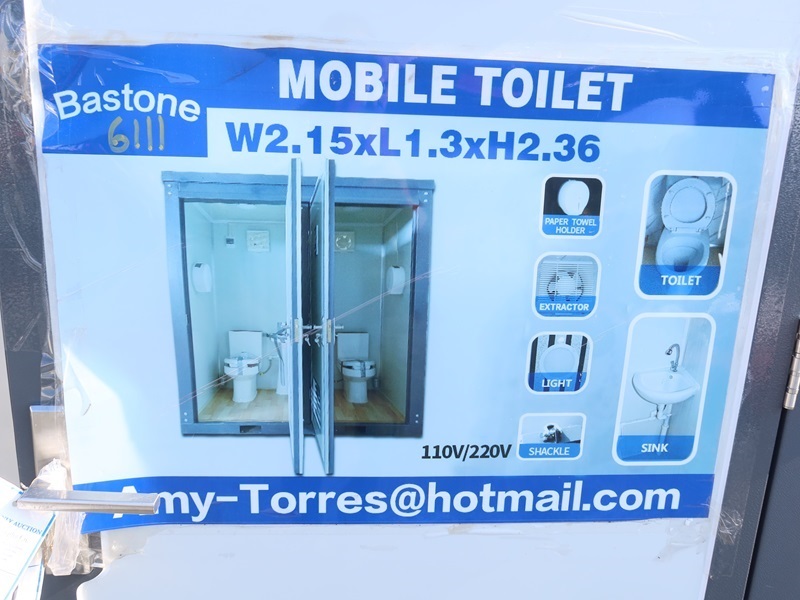 4' X 7' X 7'6" 2-DOOR PORTABLE RESTROOM W/TOILET, SINK, LIGHT & FUME EXTRACTOR W/FORK POCKETS, 110/220V (UNUSED, MEASUREMENTS ARE APPROXIMATE)