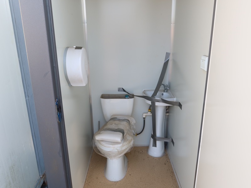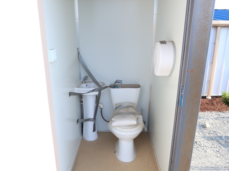 4' X 7' X 7'6" 2-DOOR PORTABLE RESTROOM W/TOILET, SINK, LIGHT & FUME EXTRACTOR W/FORK POCKETS (MEASUREMENTS ARE APPROXIMATE)