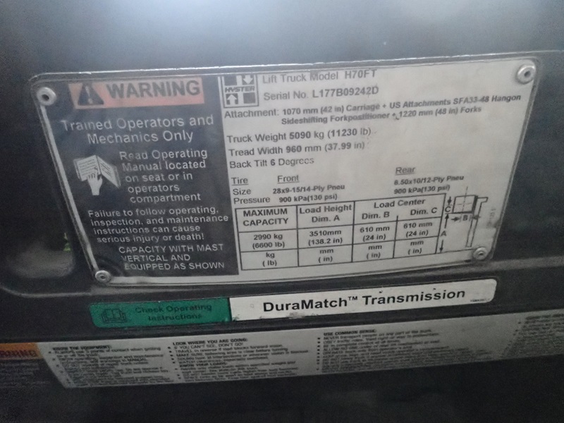 6,600 LB CAP. SOLID TIRED FORKLIFT, 138" 2-STAGE MAST, SIDE SHIFT, CAB, PROPANE, FINGER CONTROLS