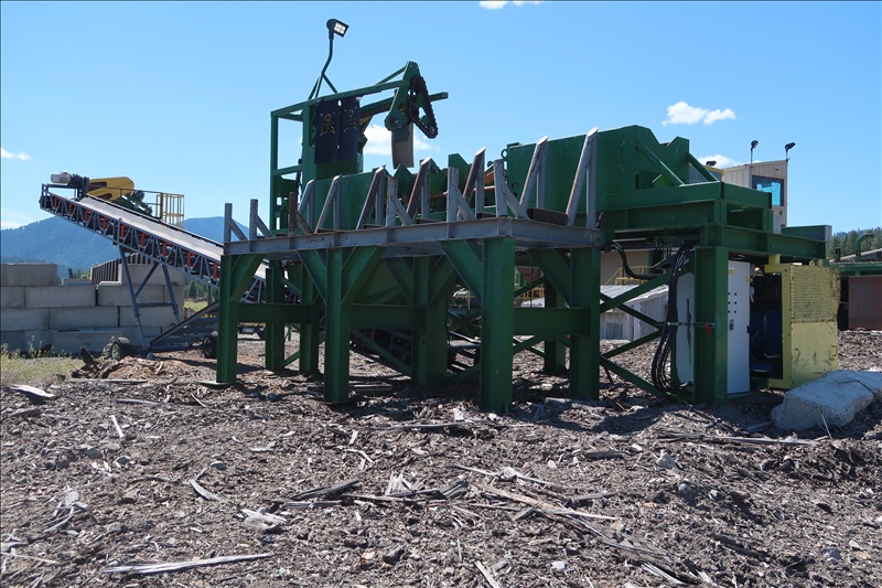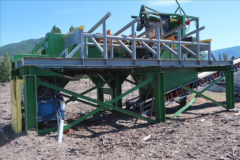 LOG BUTT REDUCER W/BRUKS BK-BR1400EMD SPIRAL BUTT REDUCER HEAD, TOSHIBA 100 HP DRIVE, SEW EURODRIVE 7-1/2 HP CHAIN DRIVE, 4-ARM LOG HOLD DOWN, 30 HP HYDRAULIC UNIT, 24" X APPROX. 52' TROUGHING BELT CLEAN OUT CONVEYOR