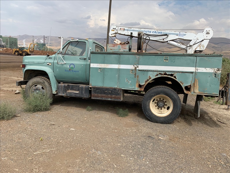 DUAL WHEEL SERVICE TRUCK W/V8 GAS ENGINE, MANUAL TRANSMISSION, 8,000 LB. CAP. AUTO CRANE, SERVICE BODY (LOCATED IN LEWISTON, ID. MUST MAKE AN APPOINTMENT TO PREVIEW, PLEASE CONTACT AUSTIN BRITTON AT 208-553-8614)
