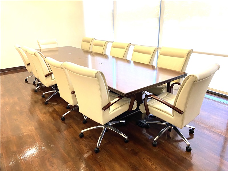 4'X14' WOOD EXECUTIVE CONFERENCE TABLE W/12 PADDED CONFERENCE ROOM ARMCHAIRS ON CASTORS & WOOD SIDE CABINET