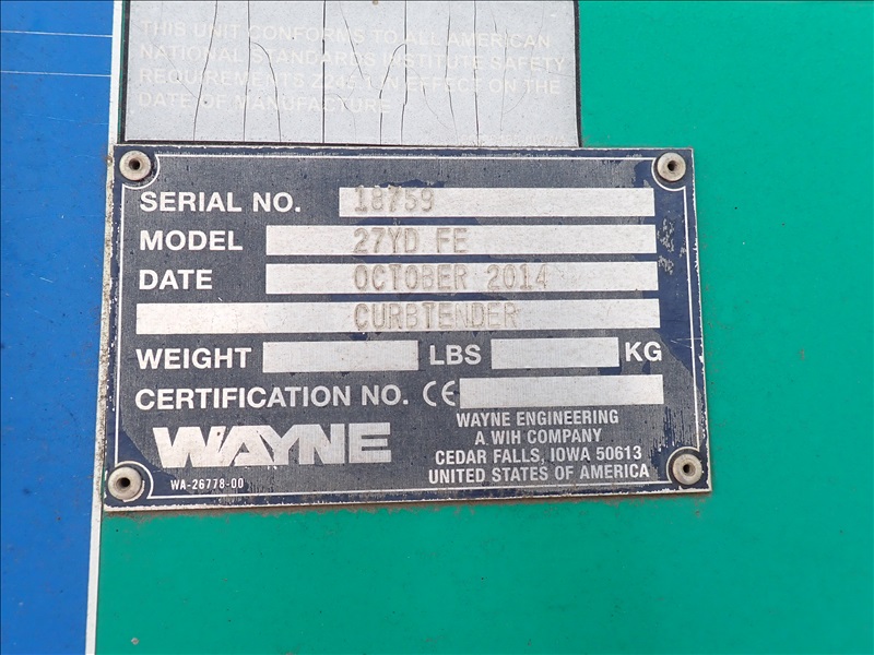 300 HP CUMMINS, AUTO, C/O, REFUSE TRUCK, WAYNE CURB TENDER 27YD FE (TO BE SOLD IN ABSENTIA LOCATED AT: 3510 S MULLENS ST - TACOMA, WA 98409, CONTACT JOEL AT 253-307-4001, REMOVAL BY THURS, OCT 19TH, MISSING PARTS, NEEDS REPAIR)