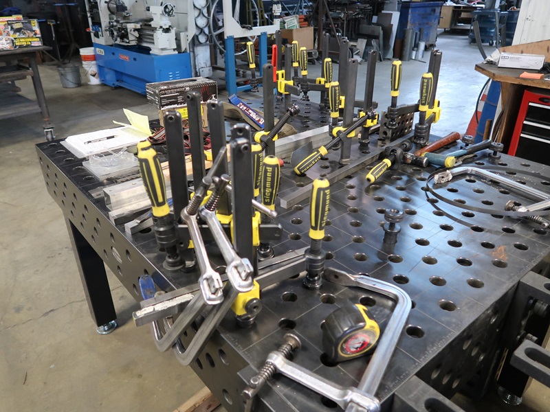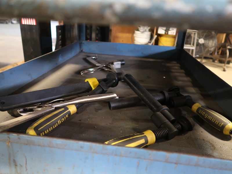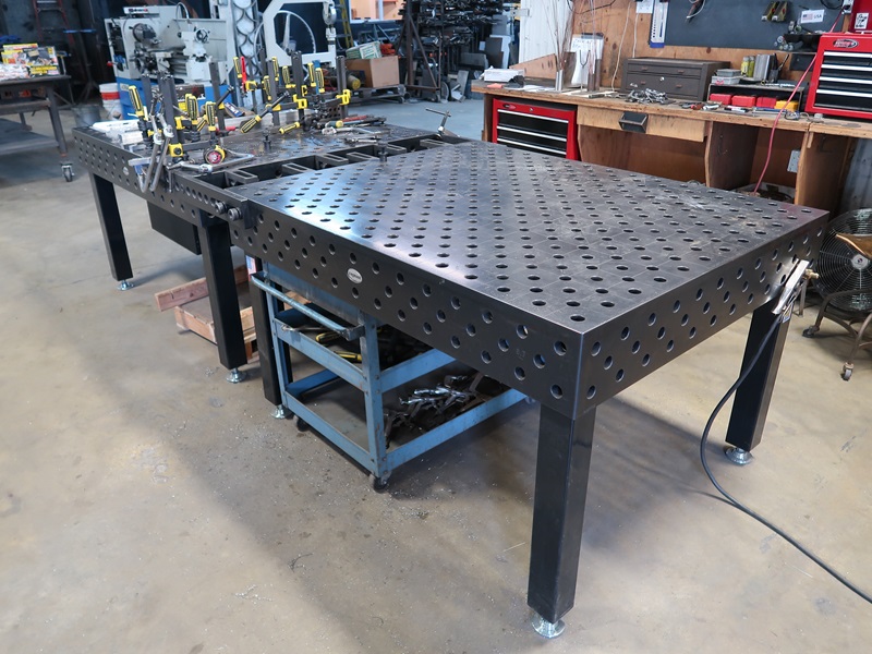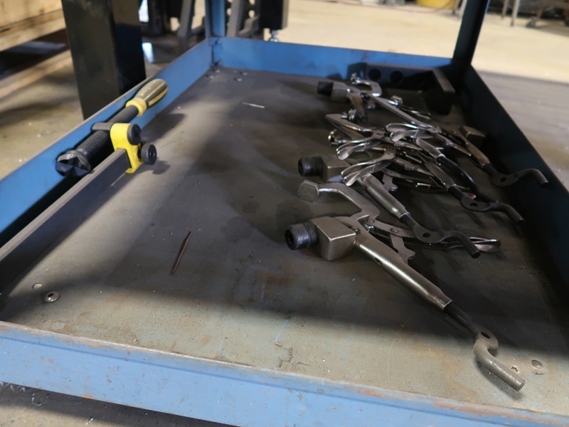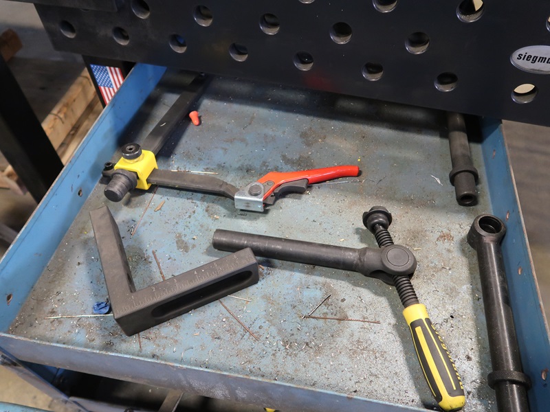 (2) SIEGMUND 5'X4' ACORN TABLES, CORNER BRACES, ASSORTED SIEGMUND CLAMPS