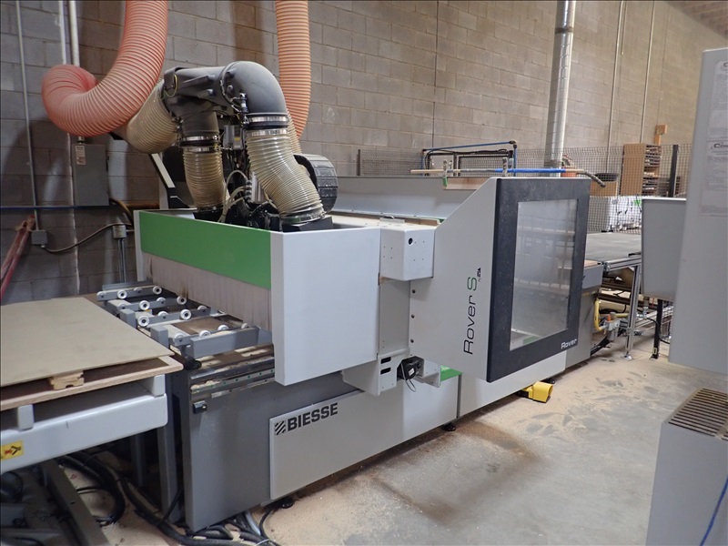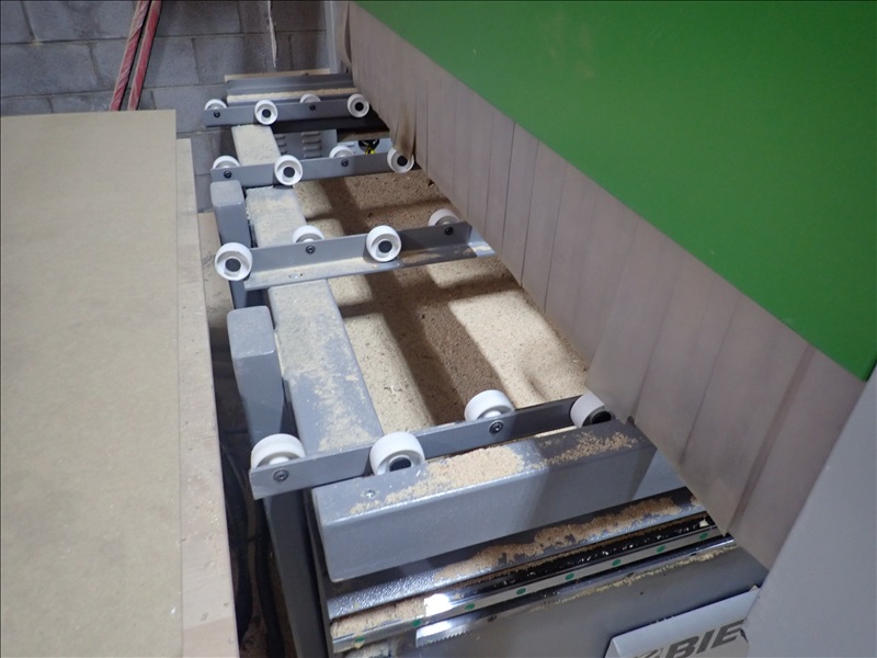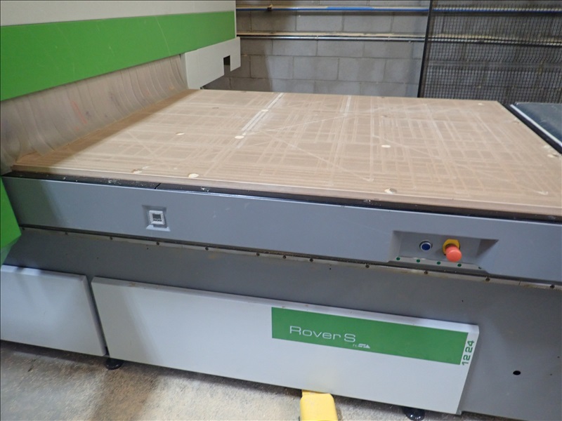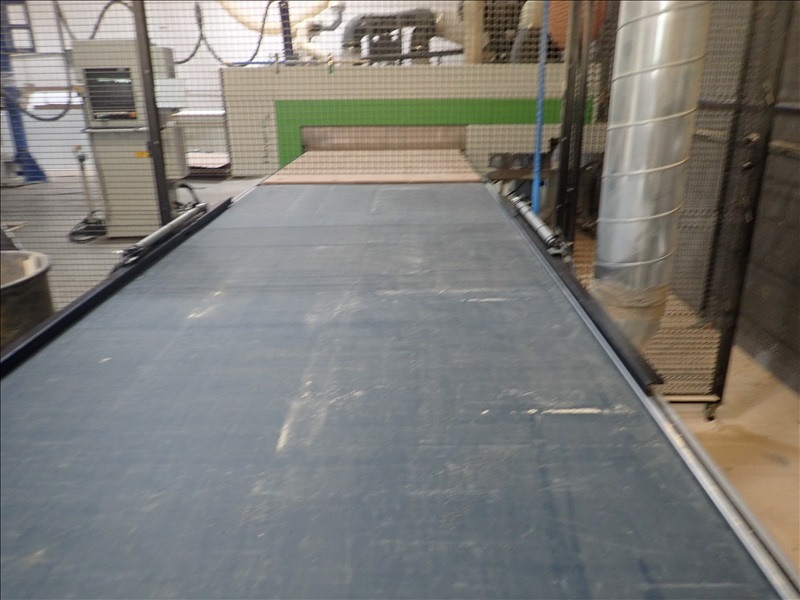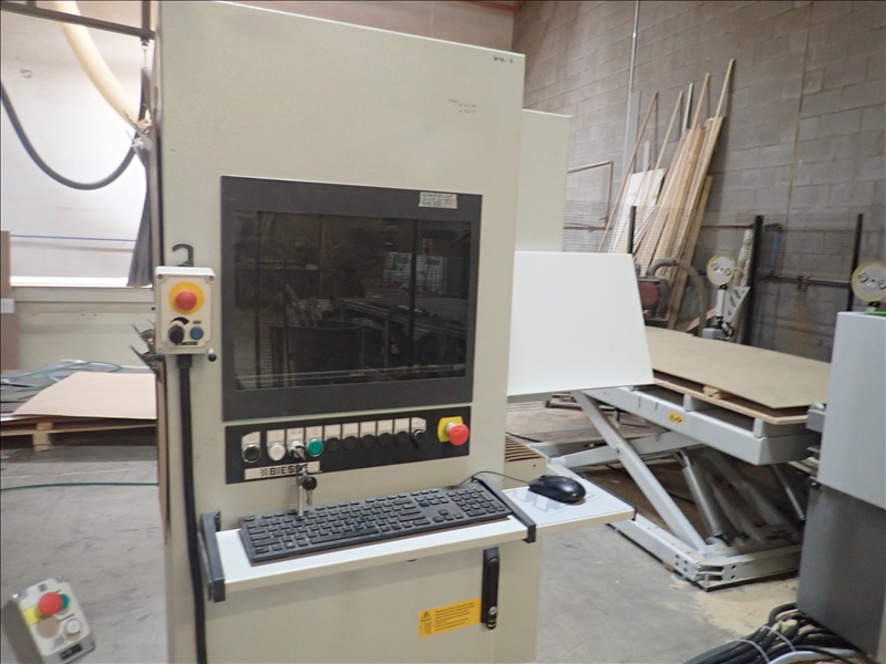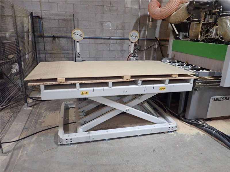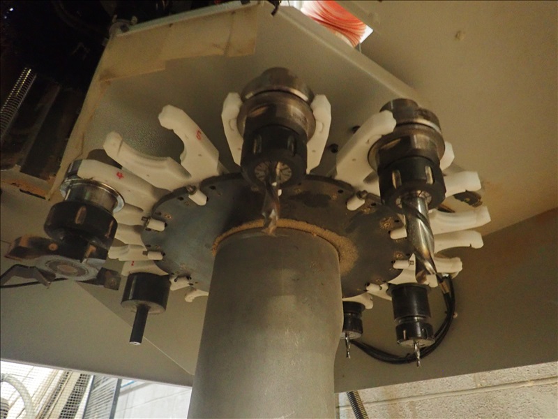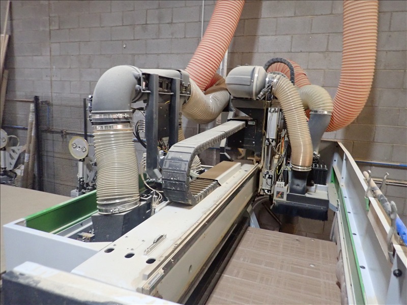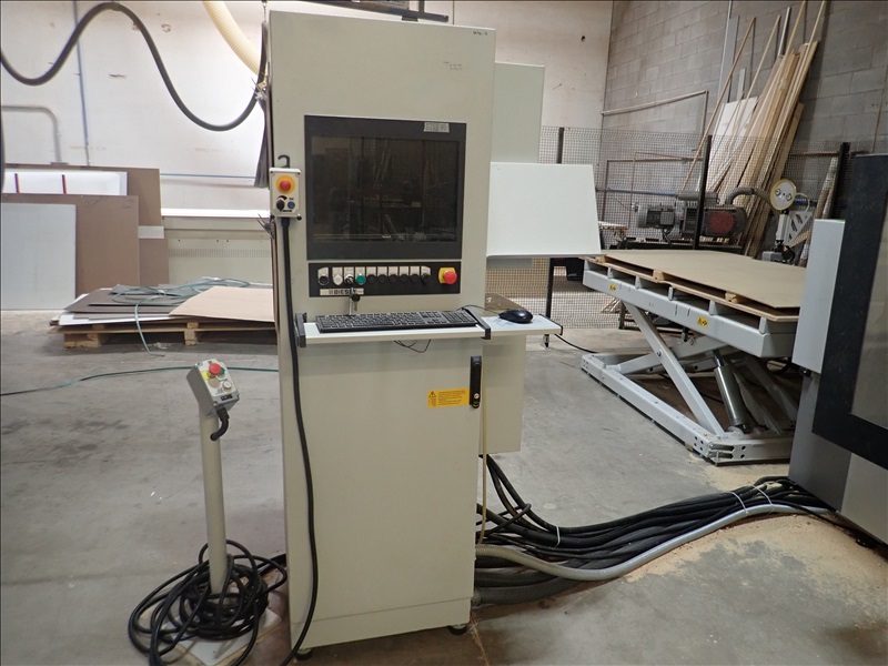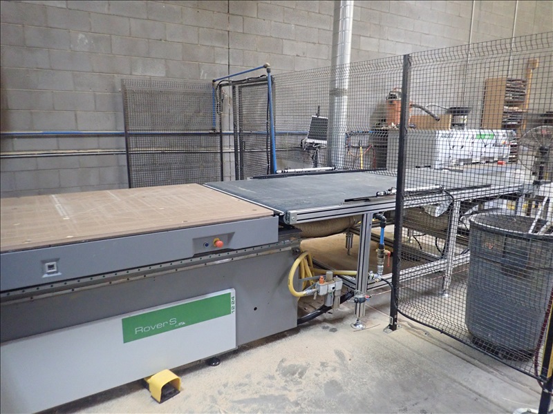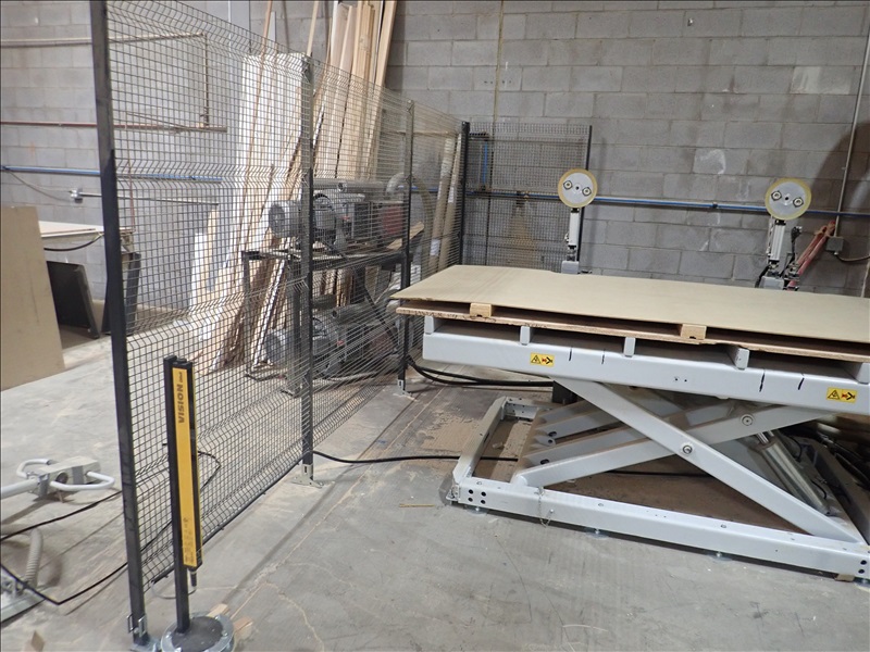 SINGLE HEAD CNC ROUTER, 4'X8' TABLE, 12-STATION ATC, 18-SPINDLE DRILL, SCISSOR LIFT, INFEED TABLE W/VACUUM LIFTERS, 4-CUP VACUUM PREFEED, OUTFEED BELT CONVEYOR, (2) BECKER VTLE-2.250 VACUUM PUMPS, REER VISION LASER CURTAINS, CAGE, CONTROLS