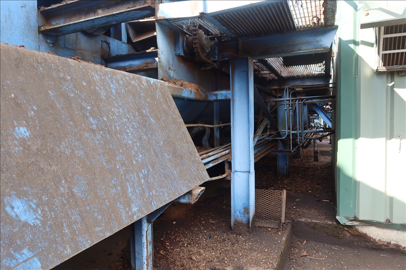 72" CHOP SAW, HYDRAULIC LOG HOLD DOWN, 10 EA 50" HOURGLASS ROLLS INFEED DECK, SPROCKET & CHAIN, 7 EA 50" OUTFEED ROLLS DECK, SPROCKET & CHAINS, SINGLE LEG SUPPORT STRUCTURE W/TOUCHING SLIDE STEEL, ATTACHED CAT WALKS & STAIRS