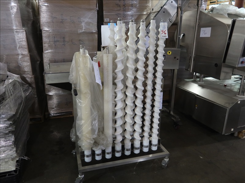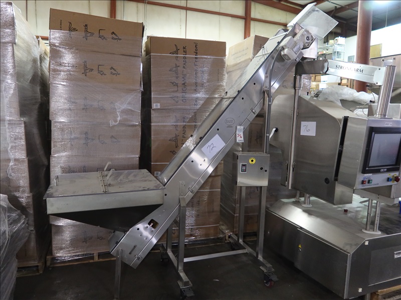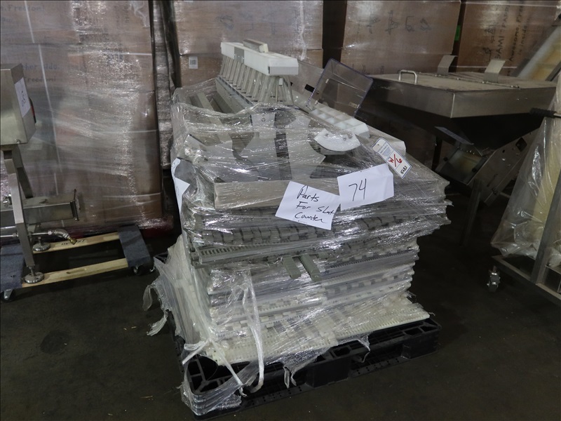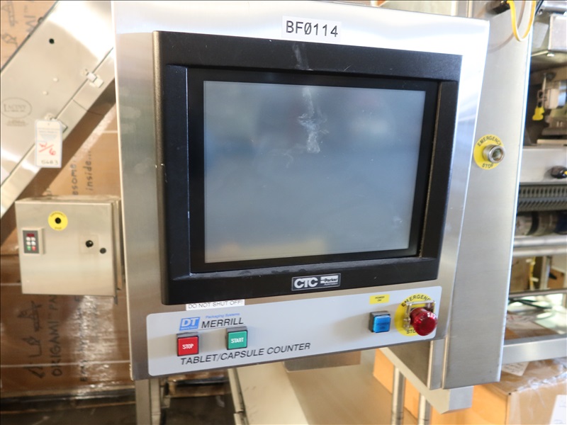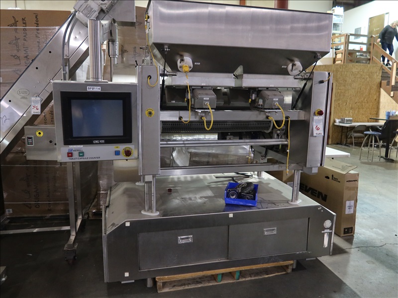 SS TABLET/CAPSULE SLAT COUNTER UNIT WITH CTC/PARKER AUTOMATION CONTROLS, (2) FMC SYNTRON F-D10-B MAGNETTE FEEDERS, SS BUCK TANK ON TOP OF UNIT, LACINY CUSTOM BUILT INFEED BULK CONVEYOR W/INPUT HOPPER ON CASTERS, ASSORTED AUGERS & BRUSHES W/CART, ASSORTED SORTING TRAYS & PARTS W/CART, 460V, 3 PHASE