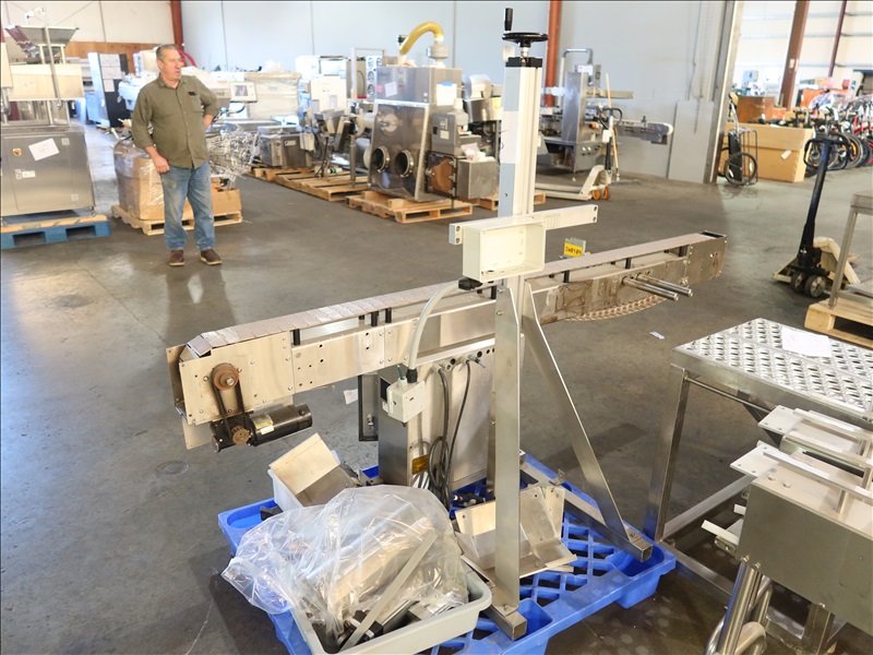 CUSTOM BUILT 4" X 96" BOTTLE CONVEYOR W/ADJUSTABLE HEIGHT MOUNTABLE HEAD PEDESTAL FRAME & ASSORTED ACCESSORIES, 220V, SINGLE PHASE (NO SIDE RAILS FOR CONVEYOR)