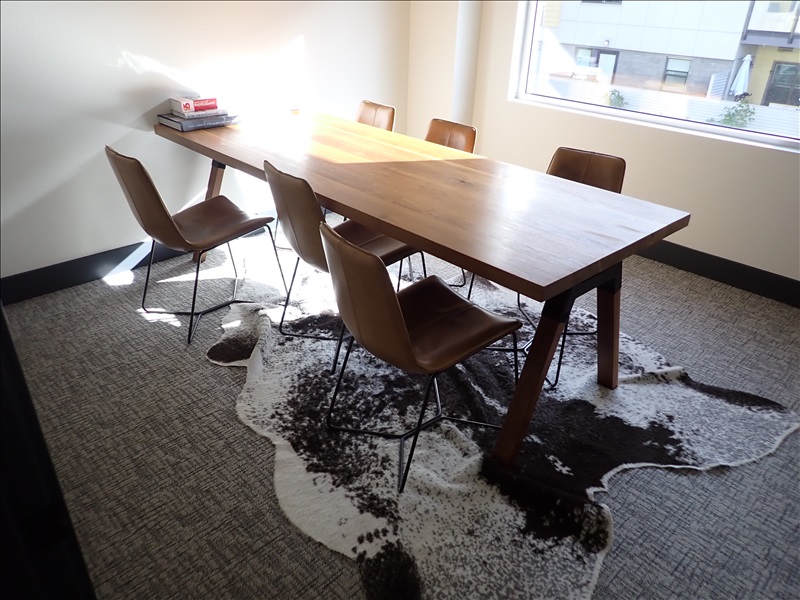 36"X96" SOLID WOOD TABLE W/(6) WEST ELM LEATHER CHAIRS & RUG