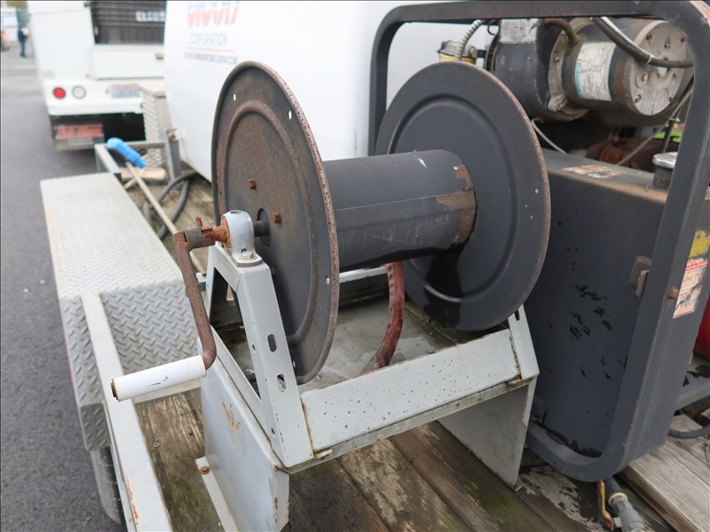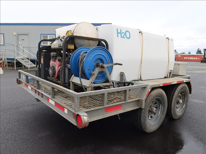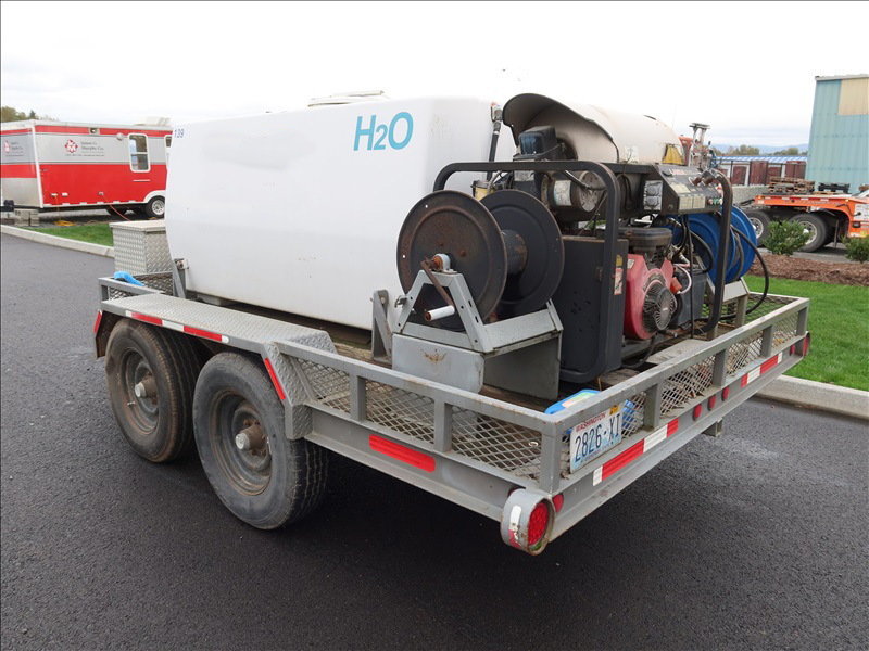 T/A, TRAILER MOUNTED HOT WATER PRESSURE WASHER, LANDA 5-3000 VANGUARD 16 HP GAS ENGINE, DIESEL FIRED 12V BURNER, 225/75R15