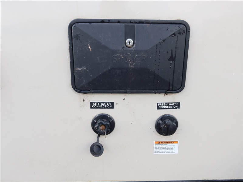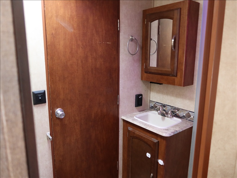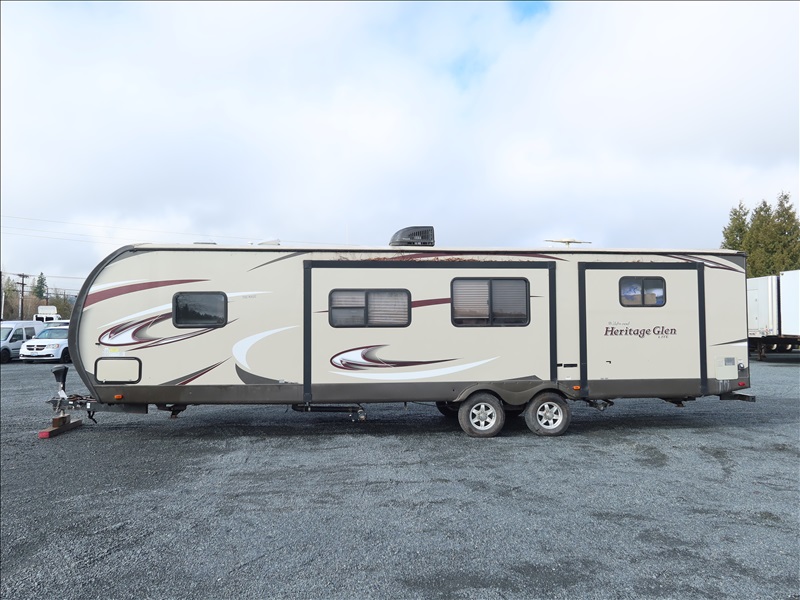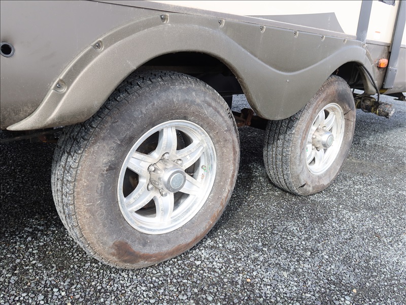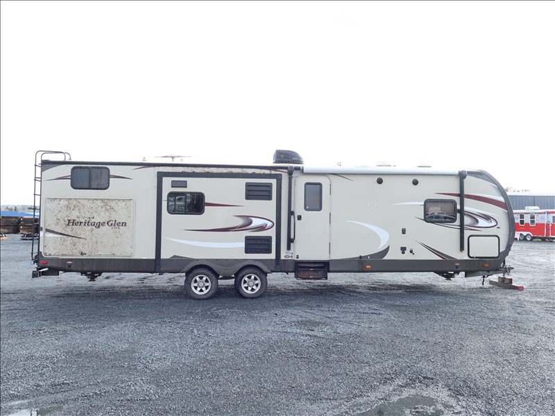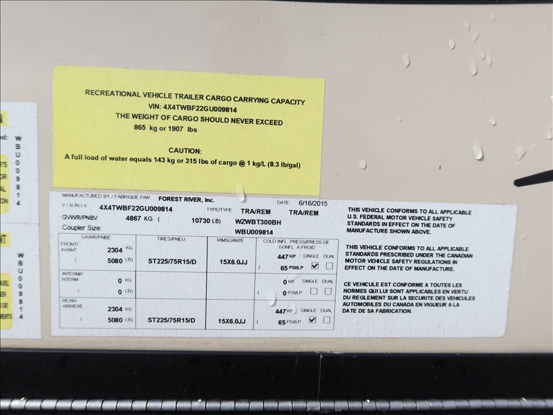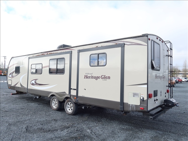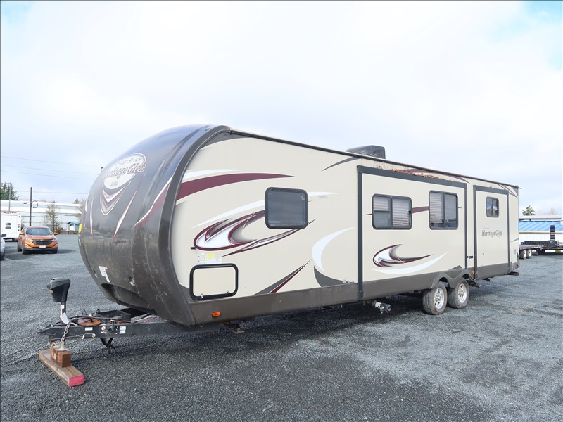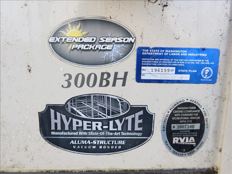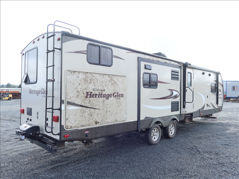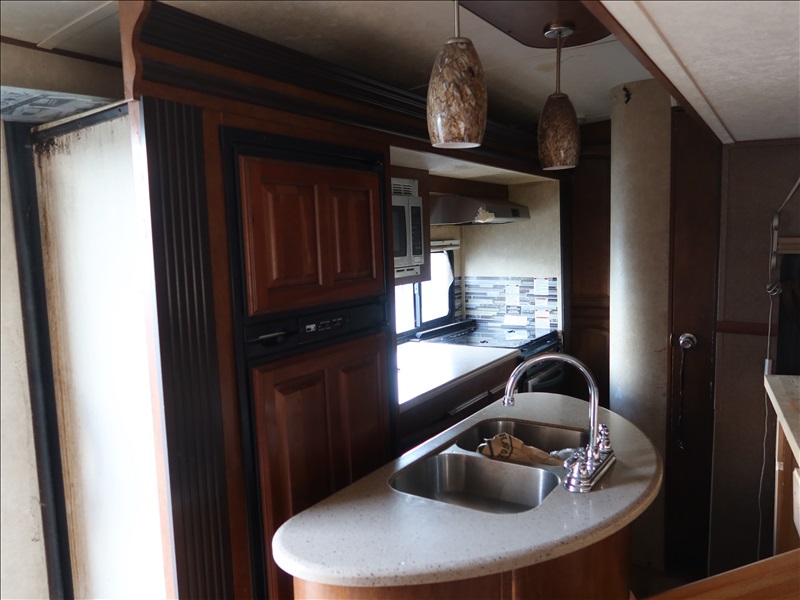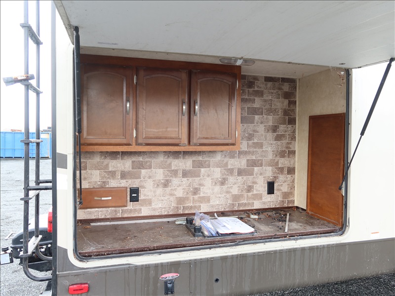 T/A, 34' 10,730 LB GVWR TRAVEL TRAILER, (3) SLIDEOUTS, AWNING, A/C, ELECT BRAKES, 225/75R15 (WATER DAMAGE, NO PROPANE TANKS, NO BATTERIES, BROKEN TONGUE JACK, CONDITION UNKNOWN, PLEASE PREVIEW)