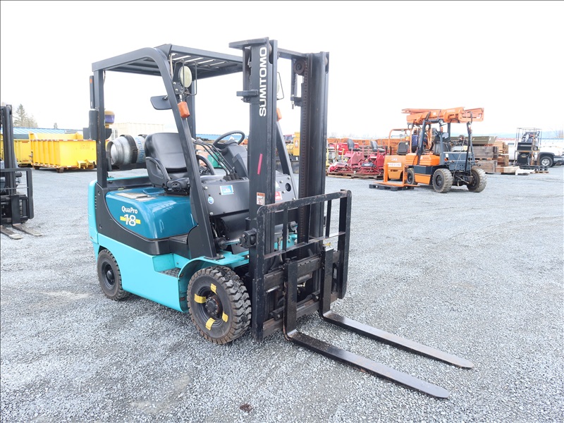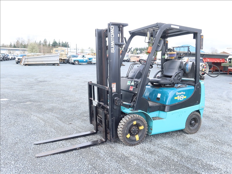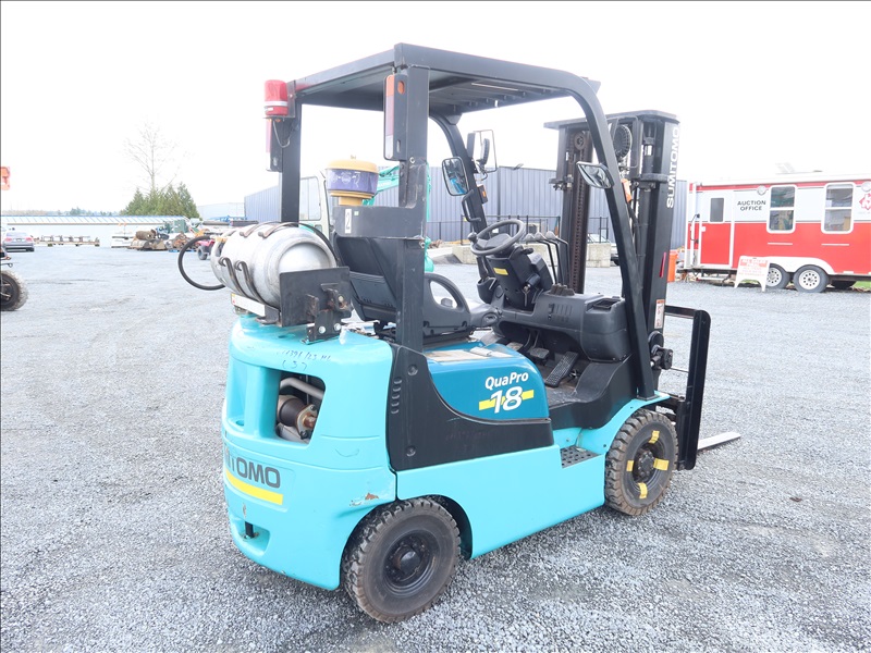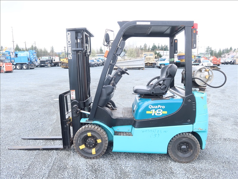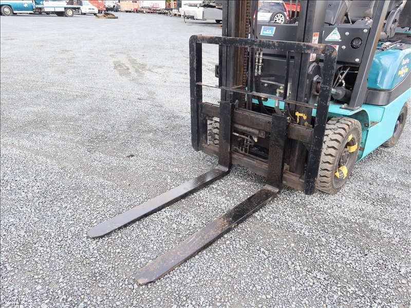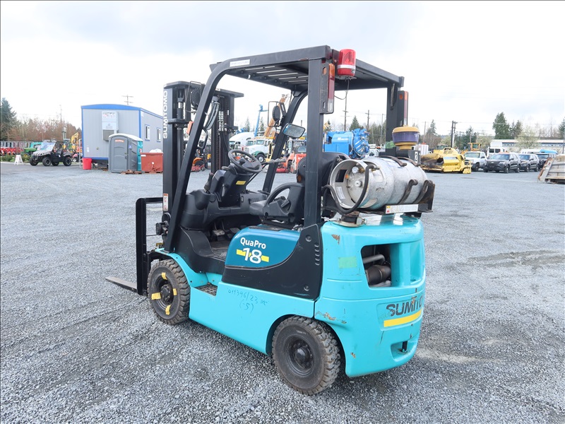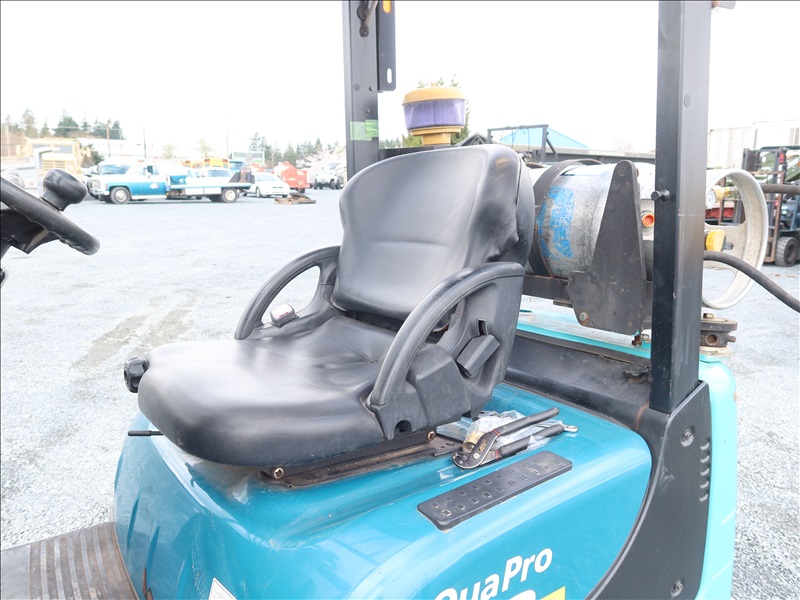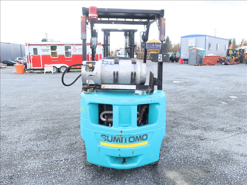 3,858 LB SOLID TIRE FORKLIFT, 118" FORK HEIGHT, 2-STAGE MAST, 4 CYL LPG (NO PROPANE TANK, CHECK ENGINE LIGHT IS ON)