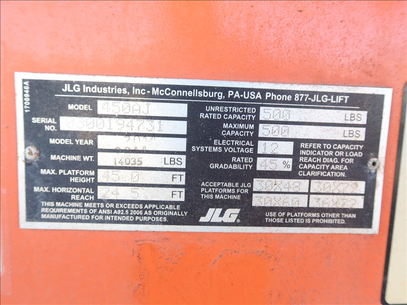 4WD ARTICULATED BOOM LIFT, 45' PLATFORM HEIGHT, 24.5' HORIZONTAL REACH, 500 LB CAPACITY, A/C RECEPTICAL AT PLATFORM, DEUTZ D-2011-L03