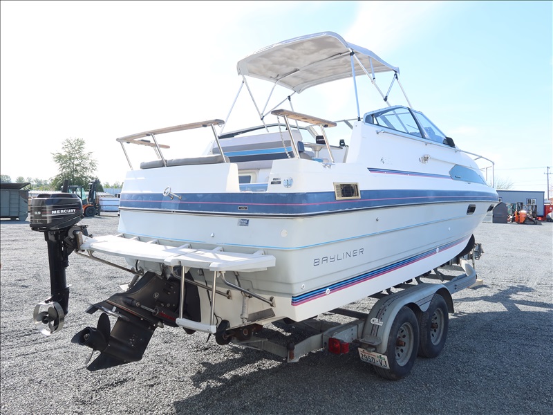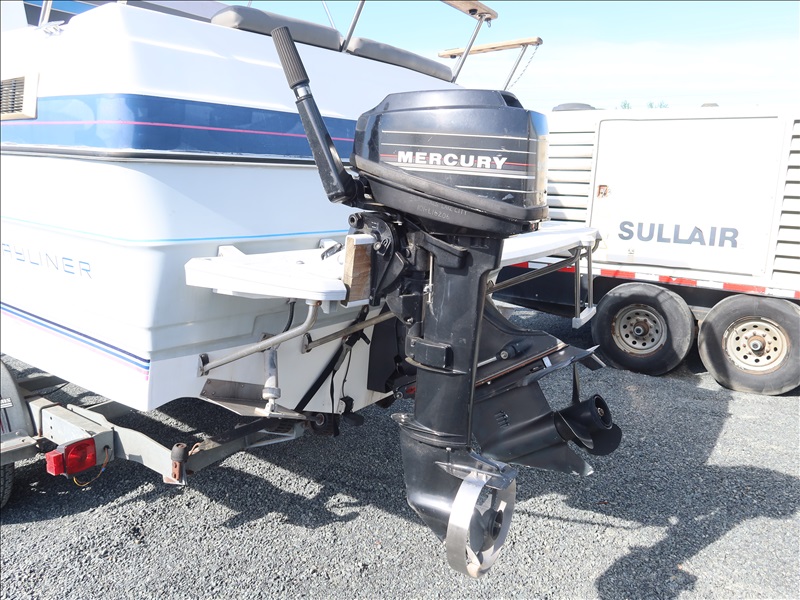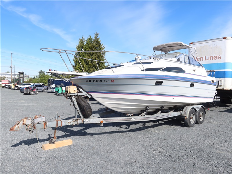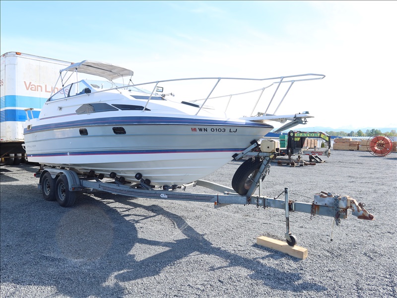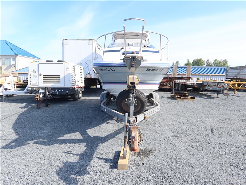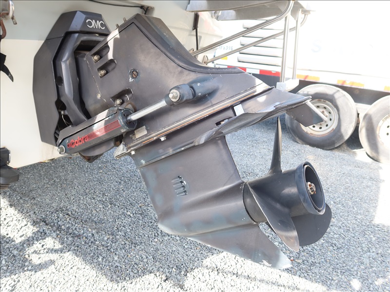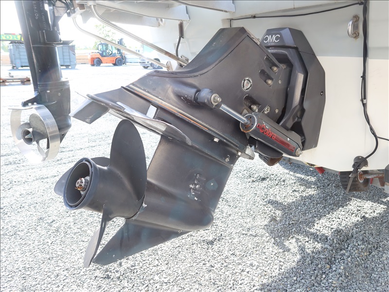 24', CABIN CRUISER, OMC V8 I/O OMC COBRA OUTDRIVE, MERCURY 9.9 TROLLING MOTOR, TRIM TABS, GARMIN 160 FISHFINDER, CANVAS TOP W/CALKINS T/A, GALVANIZED BOAT TRAILER, SURGE BRAKES, 225/75R15