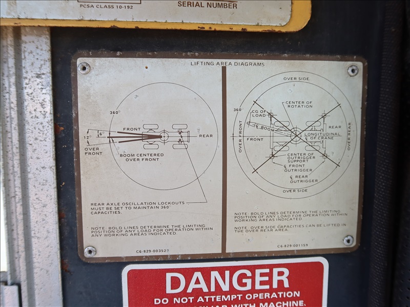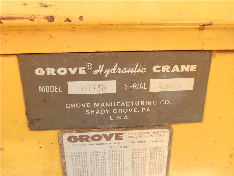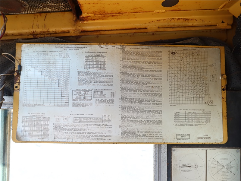40-TON ROUGH TERRAIN CRANE, 34' - 104' 4-SECTION BOOM, MAIN & AUX WINCHES, ROOSTER SHEAVE, 40-TON 3 SHEAVE BLOCK, HEADACHE BALL, KRUGER SYSTEM, CUMMINS 6 CYL, LPG HEAT, 29.5X25